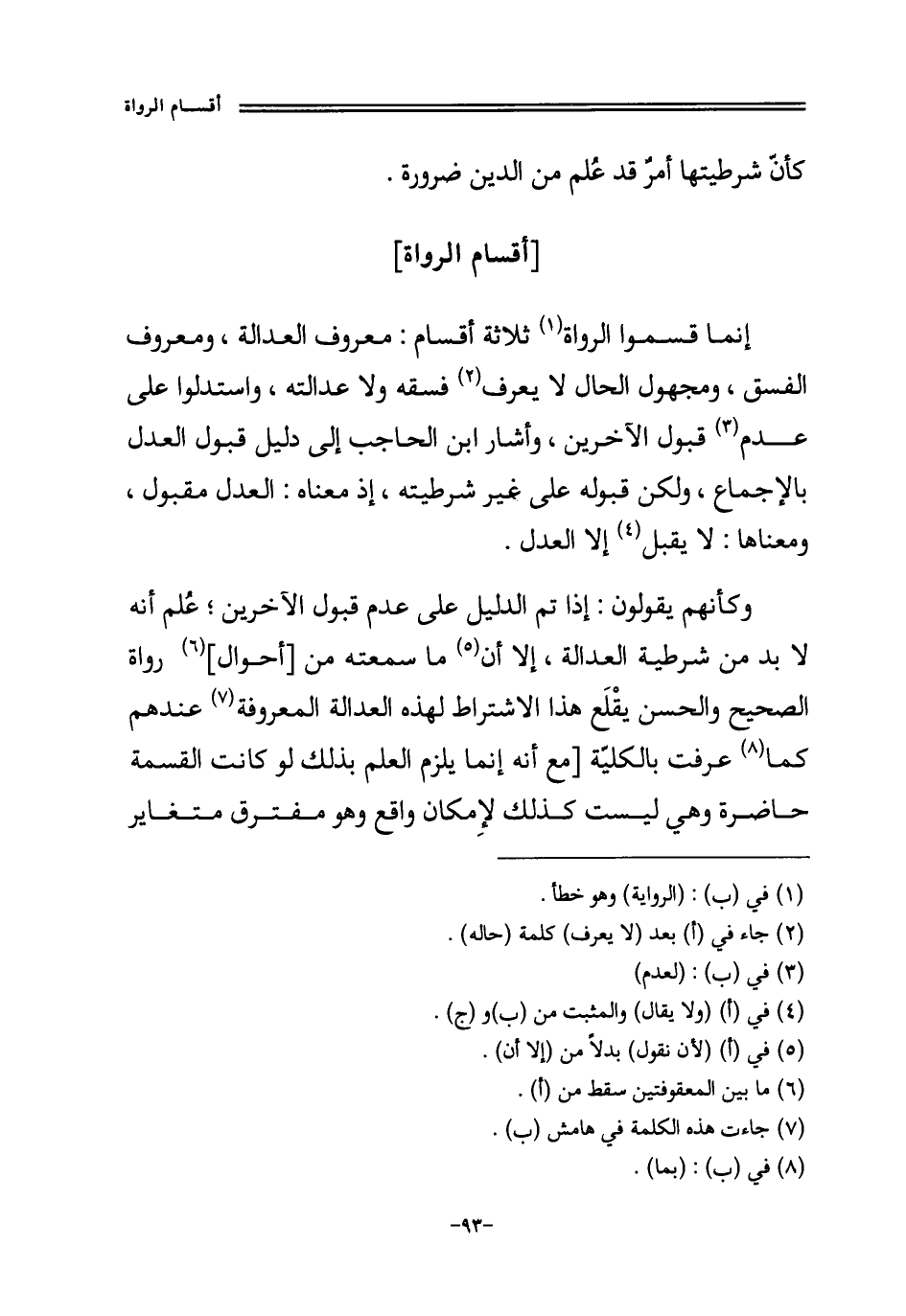 إِنَّمَا قسموا الروَاة ثَلَاثَة أَقسَام مَعْرُوف الْعَدَالَة ومعروف الْفسق ومجهول الْحَال لَا يعرف فسقه وَلَا عَدَالَته وَاسْتَدَلُّوا على عدم قبُول الآخرين وَأَشَارَ ابْن الْحَاجِب إِلَى دَلِيل قبُول الْعدْل بِالْإِجْمَاع وَلَكِن قبُوله على غير شرطيته إِذْ مَعْنَاهُ الْعدْل مَقْبُول وَمَعْنَاهَا لَا يقبل إِلَّا الْعدْل