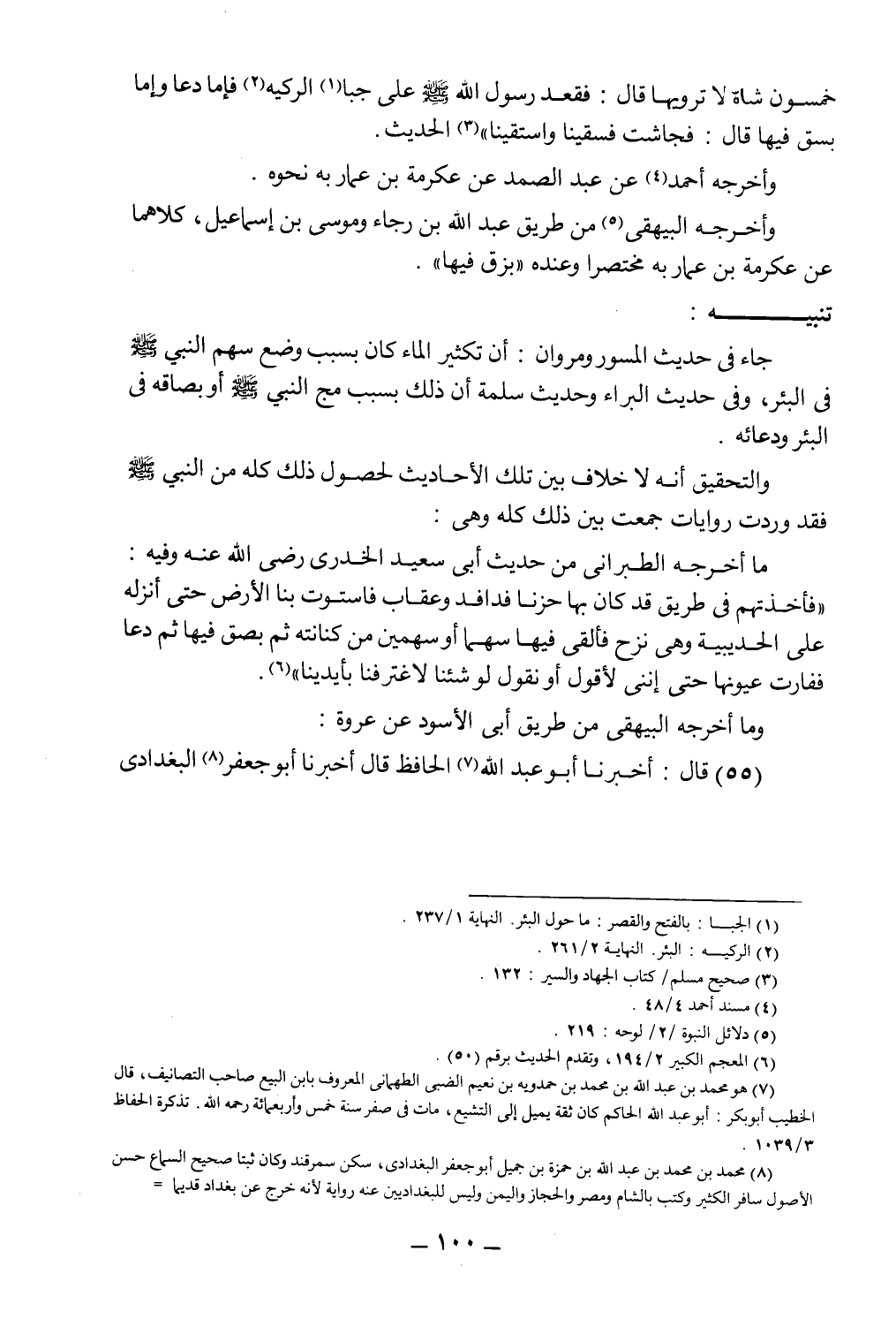 ما أخرجه الطبراني من حديث أبي سعيد الخدري رضي الله عنه وفيه: "فأخذتهم في طريق قد كان بها حزناً فدافد، وعقاب، فاستوت بنا الأرض حتى أنزله على الحديبية، وهي نزح، فألقى فيها سهما أو سهمين من كنانته ثم بصق فيها ثم دعا ففارت عيونها حتى إنني لأقول أو نقول لو شئنا لاغترفنا بأيدينا"6.