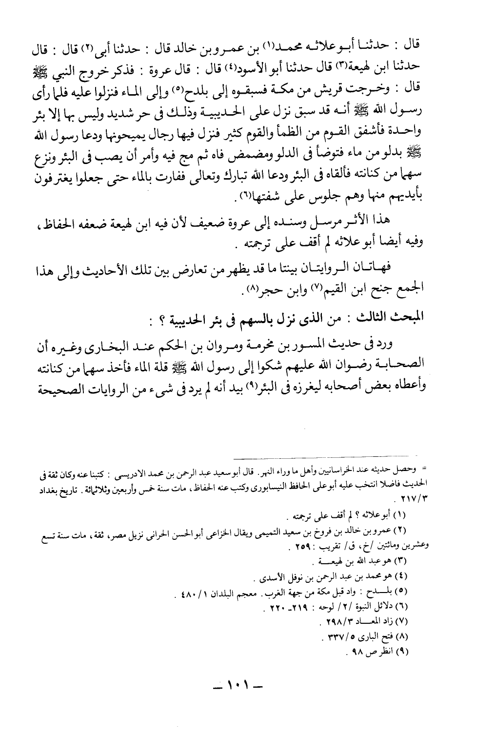 قال: حدثنا أبو علاثة محمد1 بن عمرو بن خالد قال: حدثنا أبي2 قال: قال حدثنا ابن لهيعة3 قال حدثنا أبو الأسود4 قال: قال عروة: فذكر خروج النبي صلى الله عليه وسلم قال: وخرجت قريش من مكة فسبقوه إلى بلدح5، وإلى الماء، فنزلوا عليه، فلما رآى رسول الله صلى الله عليه وسلم أنه قد سبق نزل على الحديبية، وذلك في حر شديد وليس بها إلا بئر واحدة، فأشفق القوم من الظمأ والقوم كثير، فنزل فيها رجال يميحونها، ودعا رسول الله صلى الله عليه وسلم بدلو من ماء فتوضأ في الدلو ومضمض فاه، ثم مج فيه وأمر أن يصب في البئر، ونزع سهماً من كنانته فألقاه في البئر ودعا الله تبارك وتعالى ففارت بالماء حتى جعلوا يغترفون بأيديهم منها وهم جلوس على شفتها"6.
