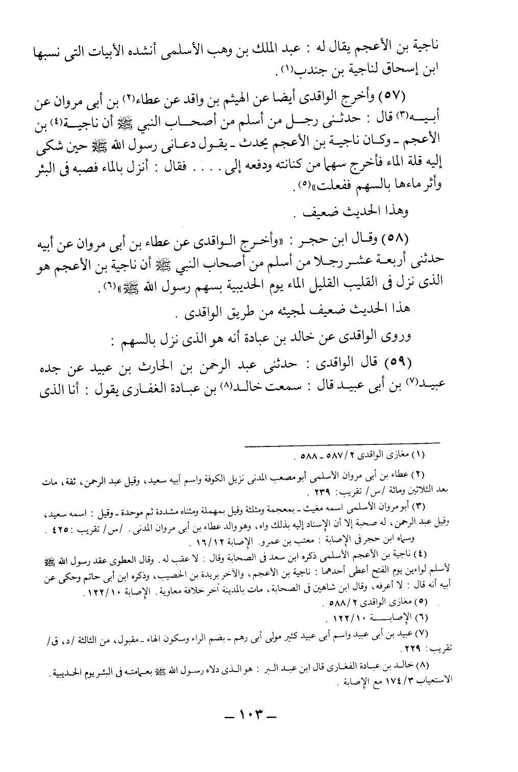 (58) وقال ابن حجر: "وأخرج الواقدي عن عطاء بن أبي مروان عن أبيه حدثني أربعة عشر رجلاً من أسلم من أصحاب النبي صلى الله عليه وسلم أن ناجية بن الأعجم هو الذي نزل في القليب القليل الماء يوم الحديبية بسهم رسول الله صلى الله عليه وسلم"6.