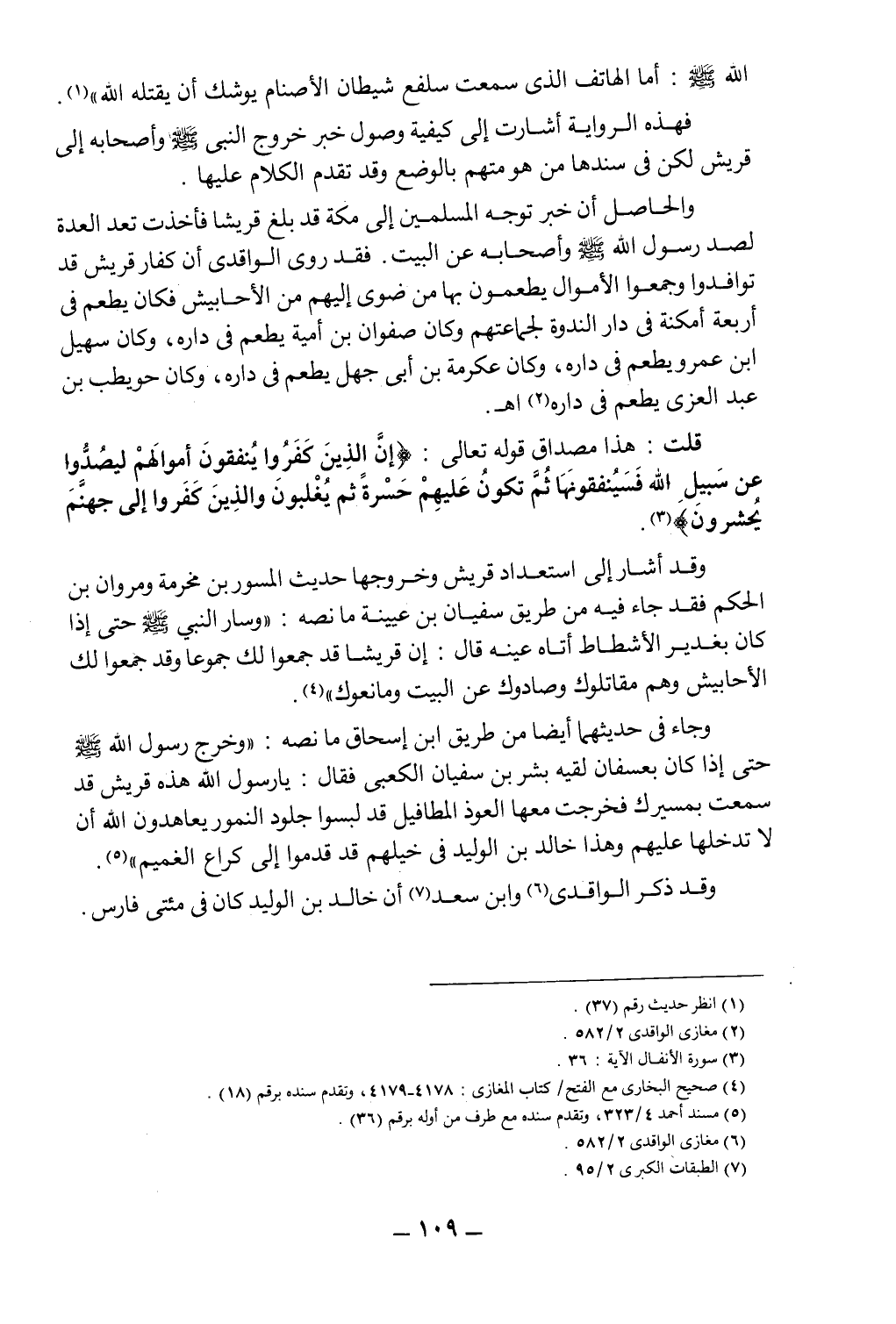 وقد أشار إلى استعداد قريش وخروجها حديث المسور بن مخرمة ومروان بن الحكم فقد جاء فيه من طريق سفيان بن عيينة ما نصه: "وسار النبي صلى الله عليه وسلم حتى إذا كان بغدير الأشطاط، أتاه عينه قال: إن قريشاً قد جمعوا لك جموعاً وقد جمعوا لك الأحابيش، وهم مقاتلوك وصادوك عن البيت ومانعوك"4.