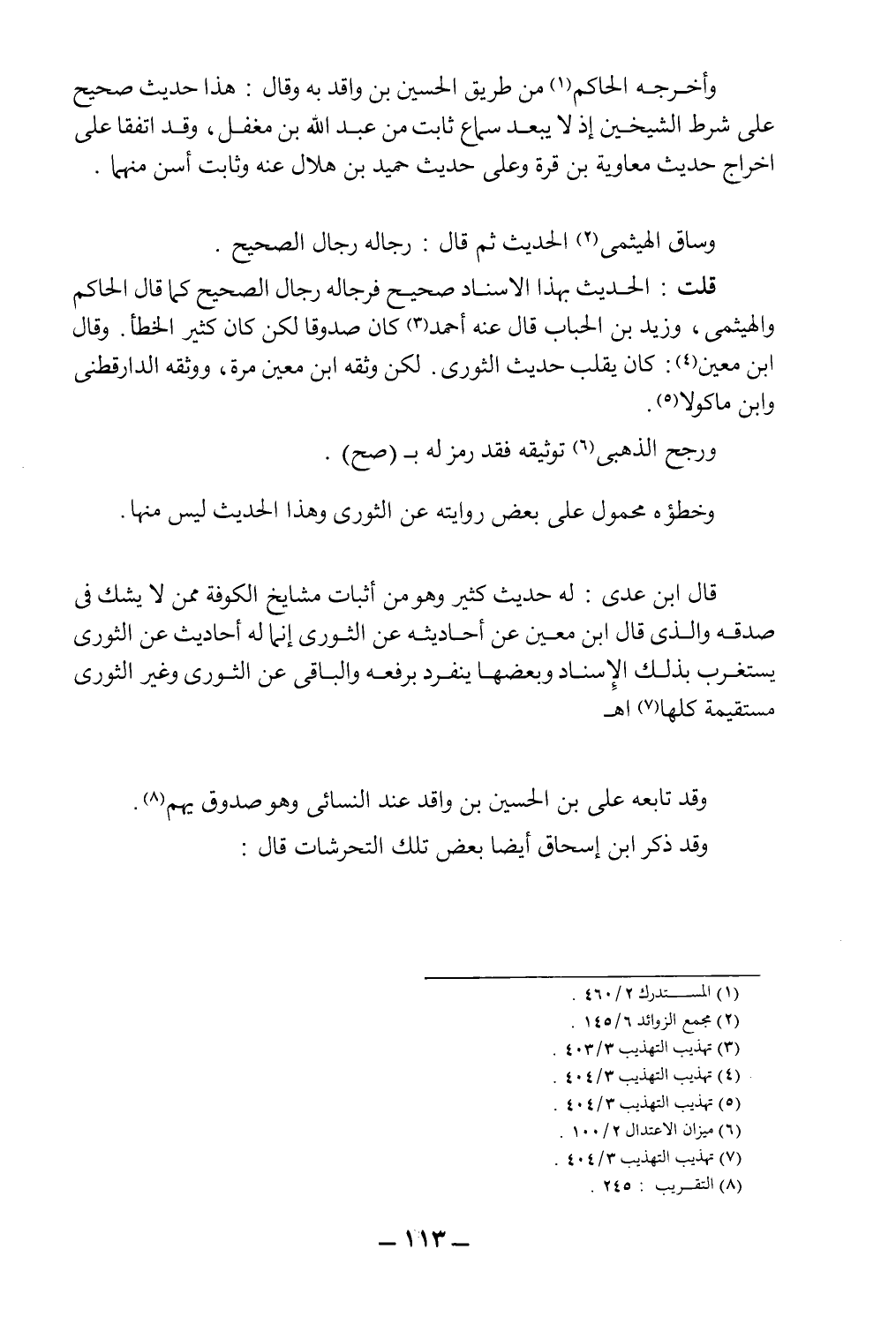 قلت: الحديث بهذا الإسناد صحيح، فرجاله رجال الصحيح كما قال الحاكم والهيثمي، وزيد بن الحباب قال عنه أحمد3 كان صدوقاً لكن كان كثير الخطأ، وقال ابن معين4: كان يقلب حديث الثوري، لكن وثقه ابن معين مرة، ووثقه الدارقطني وابن ماكولا5.