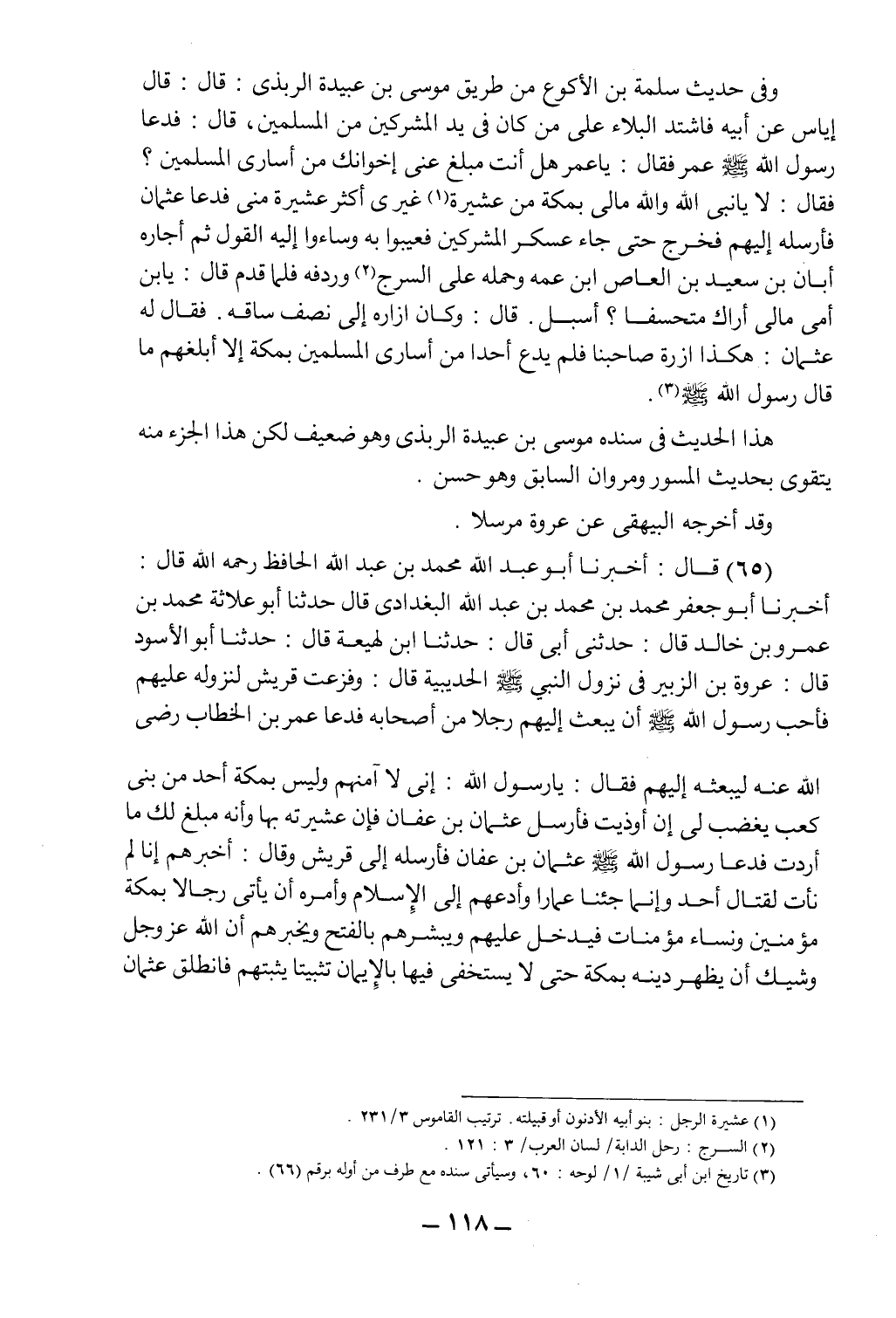 (65) قال أخبرنا أبو عبد الله محمد بن عبد الله الحافظ رحمه الله قال: أخبرنا أبو جعفر محمد بن محمد بن عبد الله البغدادي قال: حدثنا أبو علاثة محمد بن عمرو بن خالد قال: حدثني أبي قال: حدثنا ابن لهيعة قال: حدثنا أبو الأسود قال: عروة بن الزبير في نزول النبي صلى الله عليه وسلم الحديبية قال: وفزعت قريش لنزوله عليهم، فأحب رسول الله صلى الله عليه وسلم أن يبعث إليهم رجلاً من أصحابه فدعا عمر بن الخطاب رضي الله عنه ليبعثه إليه، فقال: يا رسول الله: إني لا آمنهم، وليس بمكة أحد من بني كعب يغضب لي إن أوذيت، فأرسل إلى عثمان بن عفان فإن عشيرته بها وأنه مبلغ لك ما أردت، فدعا رسول الله صلى الله عليه وسلم عثمان بن عفان فأرسله إلى قريش وقال: أخبرهم إنا لم نأت لقتال أحد، وإنما جئنا عماراً وأدعهم إلى الإسلام، وأمره أن يأتي رجالاً بمكة مؤمنين ونساء مؤمنات فيدخل عليهم ويبشرهم بالفتح ويخبرهم أن الله عز وجل وشيك أن يظهر دينه بمكة، حتى لا يستخفى فيها بالإيمان تثبيتاً يثبتهم، فانطلق عثمان