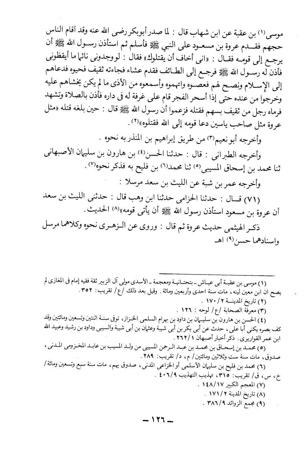 (71) قال: حدثنا الحزامي حدثنا ابن وهب قال: حدثني الليث بن سعد أن عروة بن مسعود استأذن رسول الله صلى الله عليه وسلم أن يأتي قومه"8 الحديث.