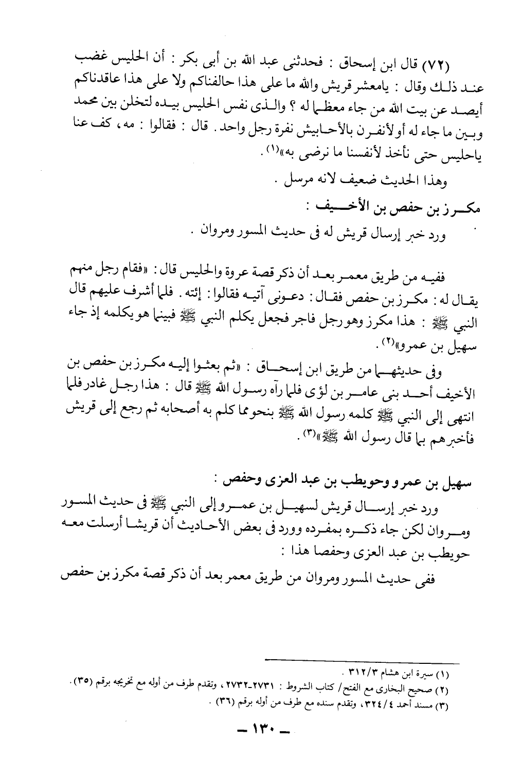 (72) قال ابن إسحاق: فحدثني عبد الله بن أبي بكر: أن الحليس غضب عند ذلك، وقال: يا معشر قريش والله ما على هذا حالفناكم، ولا على هذا عاقدناكم، أيصد عن بيت الله من جاء معظماً له؟ والذي نفس الحليس بيده لتخلن بين محمد وبين ما جاء له، أو لأنفرن بالأحابيش نفرة رجل واحد، قال: فقالوا: مه، كف عنا يا حليس، حتى نأخذ لأنفسنا ما نرضى به"1.