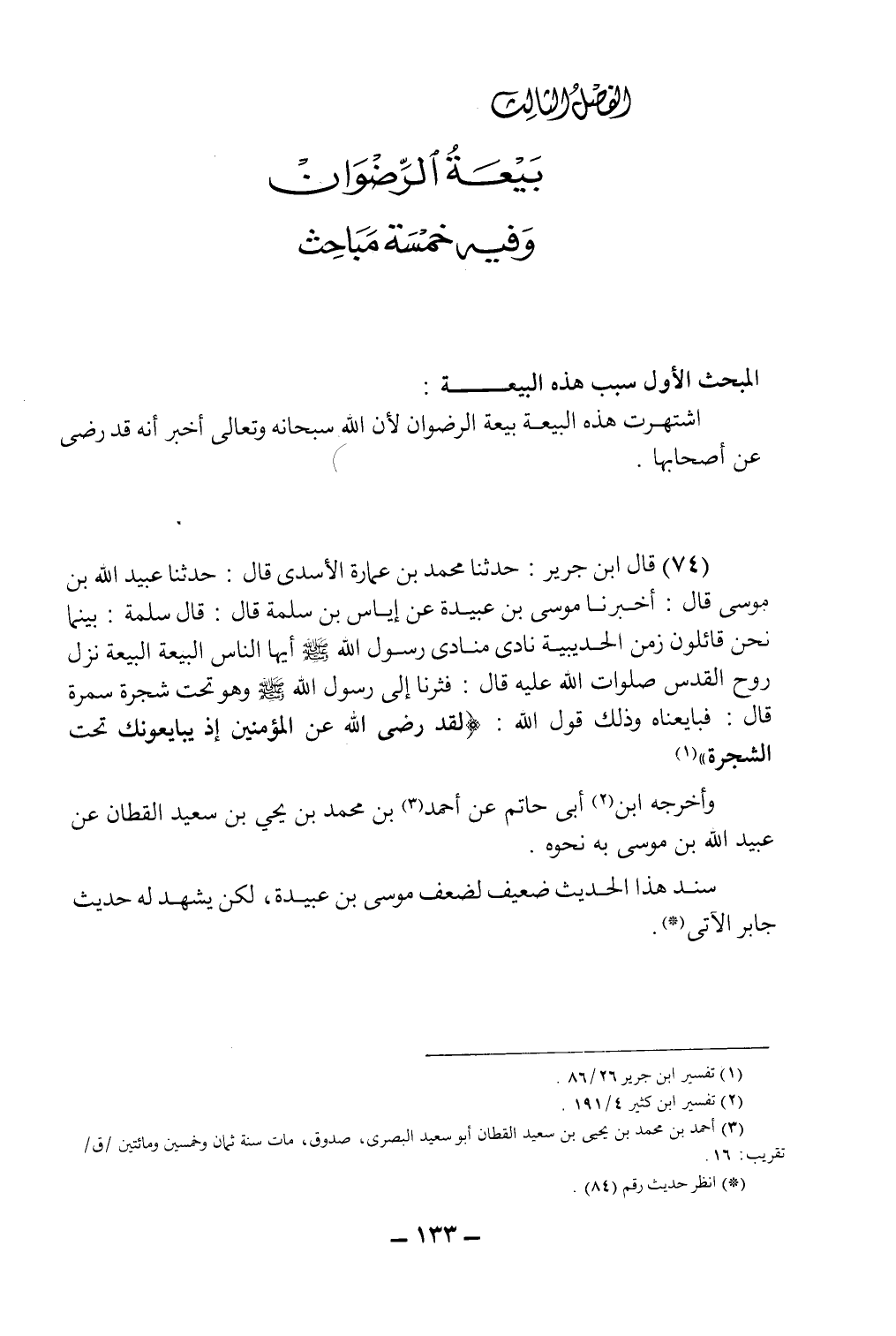 (74) قال ابن جرير: حدثنا محمد بن عمارة الأسدي قال: حدثنا عبيد الله بن موسى قال: أخبرنا موسى بن عبيدة عن إياس بن سلمة قال: قال سلمة: بينما نحن قائلون زمن الحديبية نادى منادي رسول الله صلى الله عليه وسلم، يا أيها الناس البيعة البيعة، نزل روح القدس صلوات الله عليه قال: فثرنا إلى رسول الله صلى الله عليه وسلم وهو تحت الشجرة سمرة، قال: فبايعناه، وذلك قوله الله: {لَقَدْ رَضِيَ اللَّهُ عَنِ الْمُؤْمِنِينَ إِذْ يُبَايِعُونَكَ تَحْتَ الشَّجَرَةِ} "1.