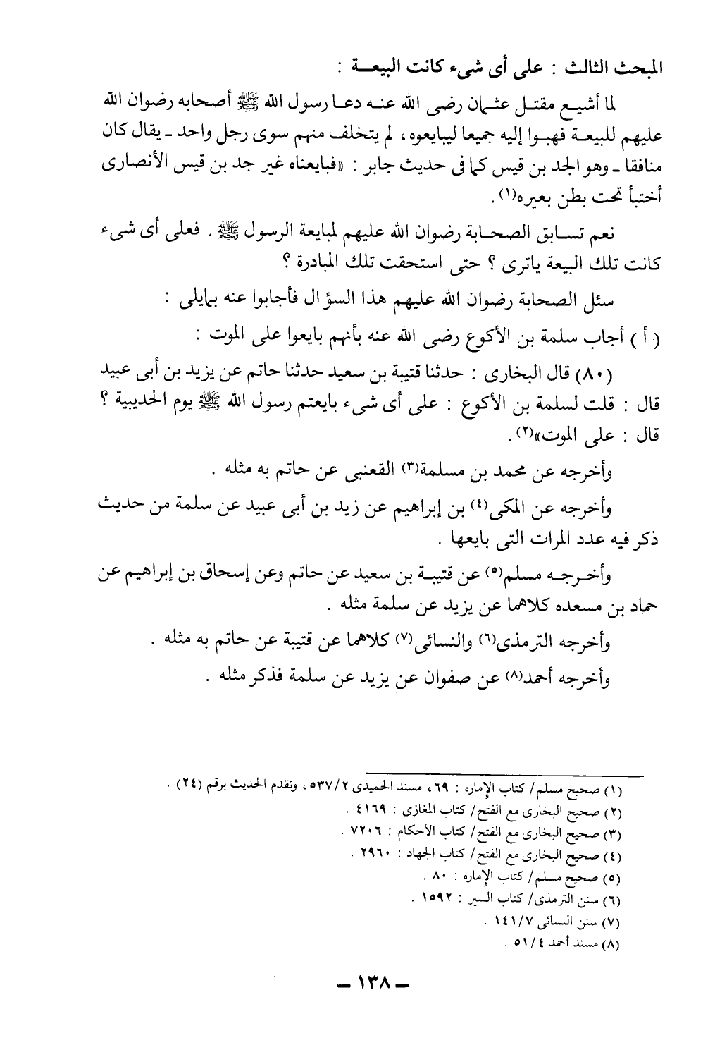 (80) قال البخاري: حدثنا قتيبة بن سعيد حدثنا حاتم بن يزيد ين أبي عبيد قال: قلت لسلمة بن الأكوع: على أي شيء بايعتم رسول الله صلى الله عليه وسلم يوم الحديبية؟ قال: على الموت"2.