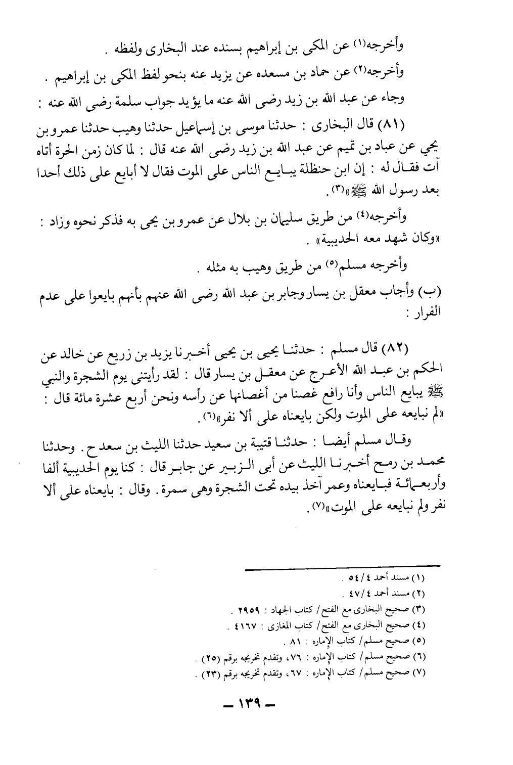 (81) قال البخاري: حدثنا موسى بن إسماعيل حدثنا وهيب حدثنا عمرو بن يحيى عن عباد بن تميم عن عبد الله بن زيد رضي الله عنه قال: لما كان زمن الحرة أتاه آت فقال له: إن ابن الحنظلة يبايع الناس على الموت، فقال: لا أبايع على ذلك أحداً بعد رسول الله صلى الله عليه وسلم"3.