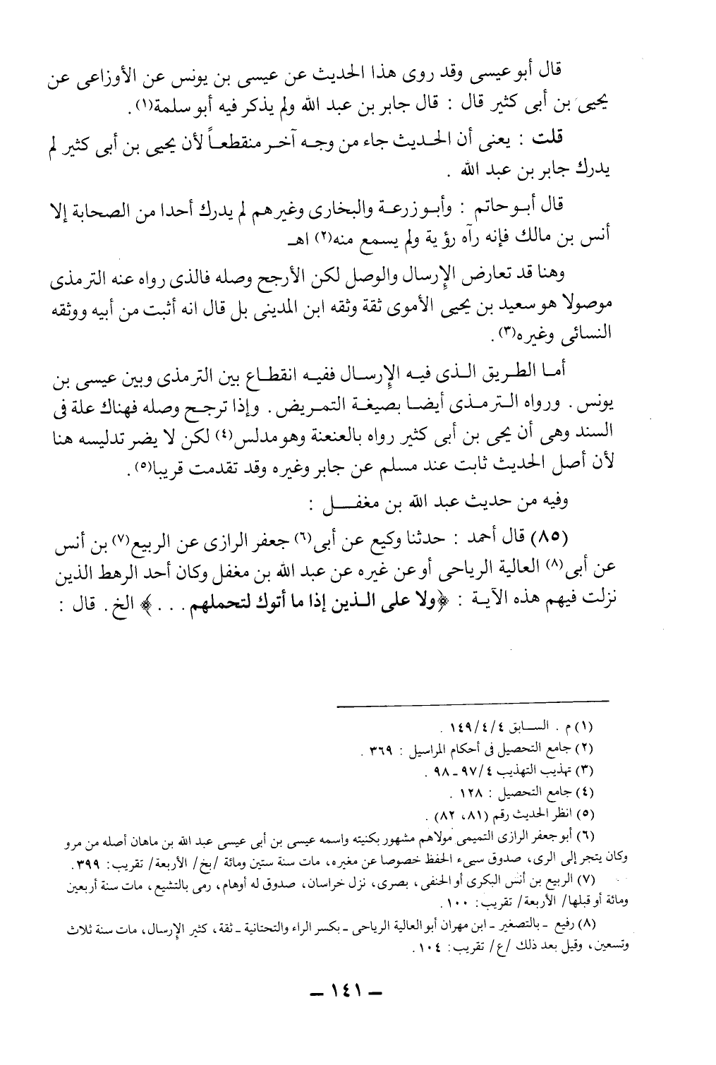 (85) قال أحمد: حدثنا وكيع عن أبي جعفر6 الرازي عن الربيع7 ابن أنس عن أبي العالية8 الرياحي أو عن غيره عن عبد الله بن مغفل وكان أحد الرهط الذين نزلت فيهم هذه الآية: {وَلاَ عَلَى الَّذِينَ إِذَا مَا أَتَوْكَ لِتَحْمِلَهُمْ ... } الخ، قال: