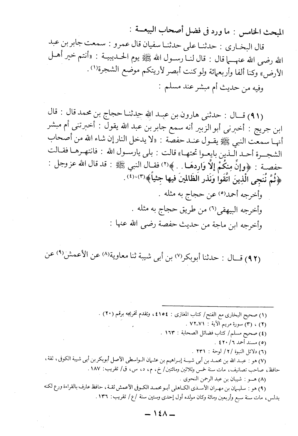 (91) قال: حدثني هارون بن عبد الله حدثنا حجاج بن محمد قال: قال ابن جريج: أخبرني أبو الزبير أنه سمع جابر بن عبد الله يقول: أخبرتني أم مبشر أنها سمعت النبي صلى الله عليه وسلم يقول عند حفصة: "لا يدخل النار إن شاء الله من أصحاب الشجرة أحد الذين بايعوا تحتها" قالت: بلى يا رسول الله: فانتهرها فقال: حفصة: {وَإِن مِّنكُمْ إِلاَّ وَارِدُهَا} 2، فقال النبي صلى الله عليه وسلم: قد قال الله عز وجل: {ثُمَّ نُنَجِّي الَّذِينَ اتَّقَوا وَّنَذَرُ الظَّالِمِينَ فِيهَا جِثِيًّا} 3.4