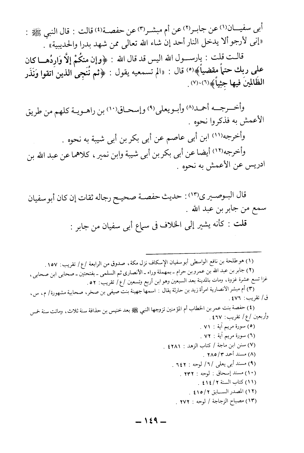 قال البوصيري13: حديث حفصة صحيح رجاله ثقات، إن كان أبو سفيان سمع من جابر بن عبد الله.