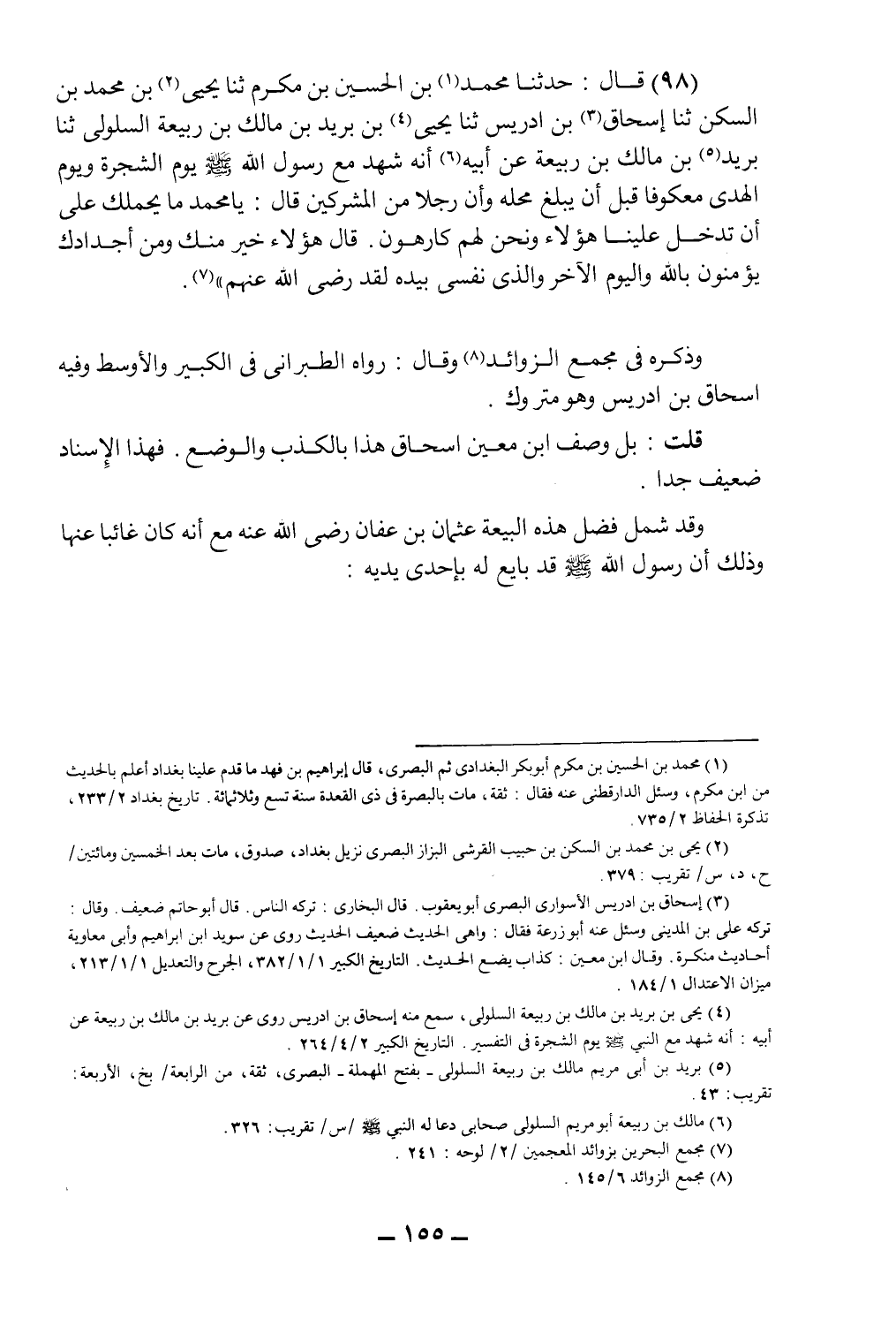 (98) قال: حدثنا محمد1 بن الحسين بن مكرم ثنا يحيى2 ابن محمد بن السكن ثنا إسحاق3 بن إدريس ثنا يحيى4 بن بريد ابن مالك بن ربيعة السلولي ثنا بريد5 بن مالك بن ربيعة عن أبيه6 أنه شهد مع رسول الله صلى الله عليه وسلم يوم الشجرة ويوم الهدي معكوفاً قبل أن يبلغ محله، وأن رجلاً من المشركين قال: يا محمد ما يحملك على أن تدخل علينا هؤلاء ونحن لهم كارهون، قال: "هؤلاء خير منك ومن أجدادك يؤمنون بالله واليوم الآخر والذي نفسي بيده لقد رضي الله عنهم"7.