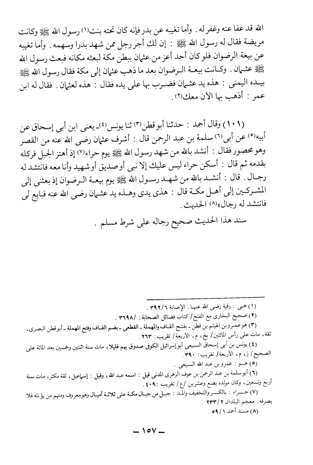 (101) وقال أحمد: حدثنا أبو قطن3 ثنا يونس4 - يعني ابن أبي إسحاق عن أبيه5 عن أبي6 سلمة بن عبد الرحمن قال: أشرف عثمان رضي الله عنه من القصر وهو محصور، فقال: أنشد بالله من شهد رسول الله صلى الله عليه وسلم يوم حراء7 إذ اهتز الجبل فركله بقدمه ثم قال: اسكن حراء ليس عليك إلا نبي أو صديق أو شهيد وأنا معه فانتشد له رجال، قال: أنشد بالله من شهد رسول الله صلى الله عليه وسلم يوم بيعة الرضوان إذ بعثني إلى المشركين إلى أهل مكة قال: "هذي يدي وهذه يد عثمان رضي الله عنه فبايع لي فانتشد له رجال"8 الحديث.