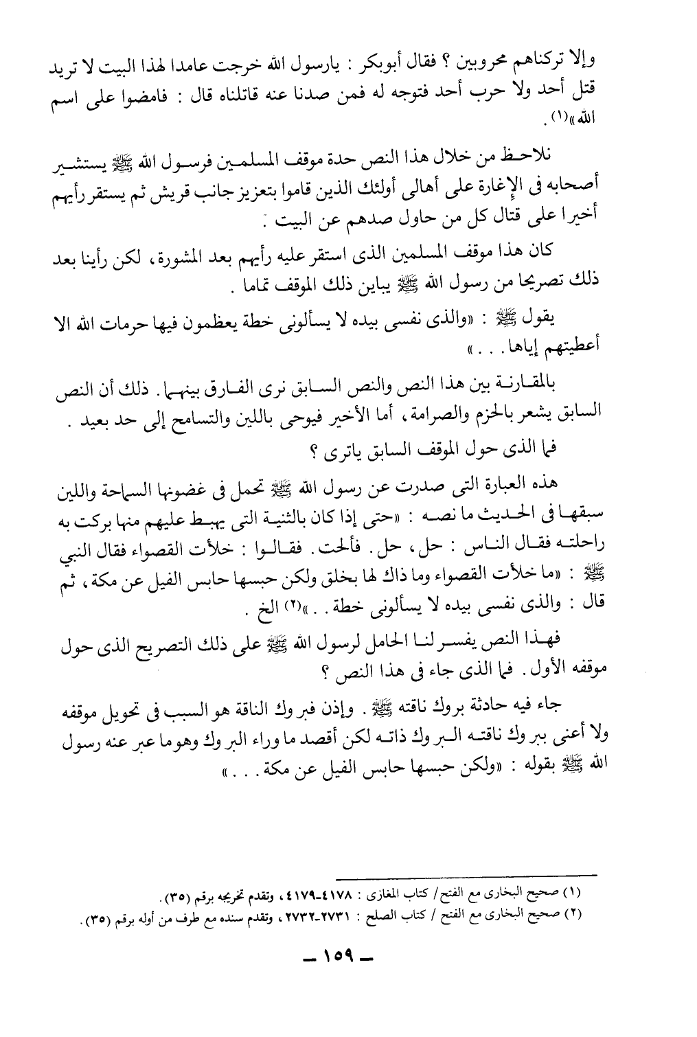 جاء فيه حادثة بروك ناقته صلى الله عليه وسلم، وإذن فبروك الناقة هو السبب في تحويل موقفه، ولا أعني ببروك ناقته البروك ذاته لكن أقصد ما وراء البروك وهو ما عبر عنه رسول الله صلى الله عليه وسلم بقوله: "ولكن حبسها حابس الفيل عن مكة ... ".