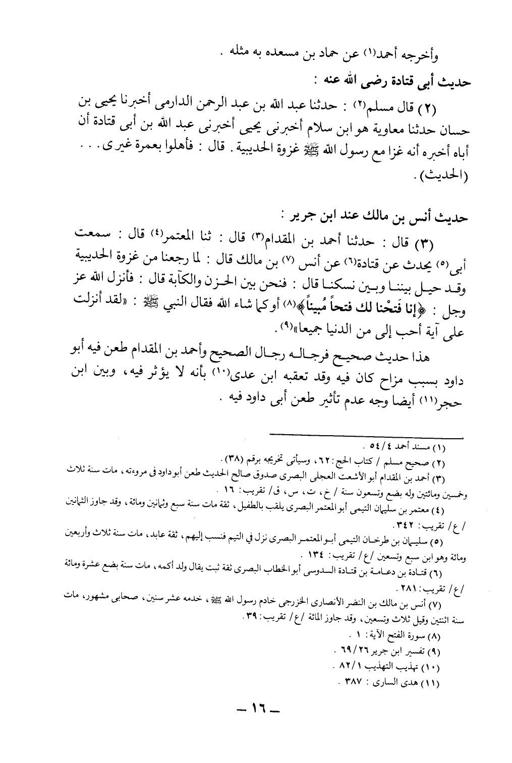(3) قال: حدثنا أحمد بن المقدام3، قال: ثنا المعتمر4 قال: سمعت أبي5 يحدث عن قتادة6 عن أنس7 بن مالك قال: "لما رجعنا من غزوة الحديبية وقد حيل بيننا وبين نسكنا قال: فنحن بين الحزن والكآبة، قال: فأنزل الله عز وجل: {إِنَّا فَتَحْنَا لَكَ فَتْحًا مُّبِينًا} 8 أو كما شاء الله فقال النبي صلى الله عليه وسلم: "لقد أنزلت علي آية أحب إلي من الدنيا جميعاً"9.