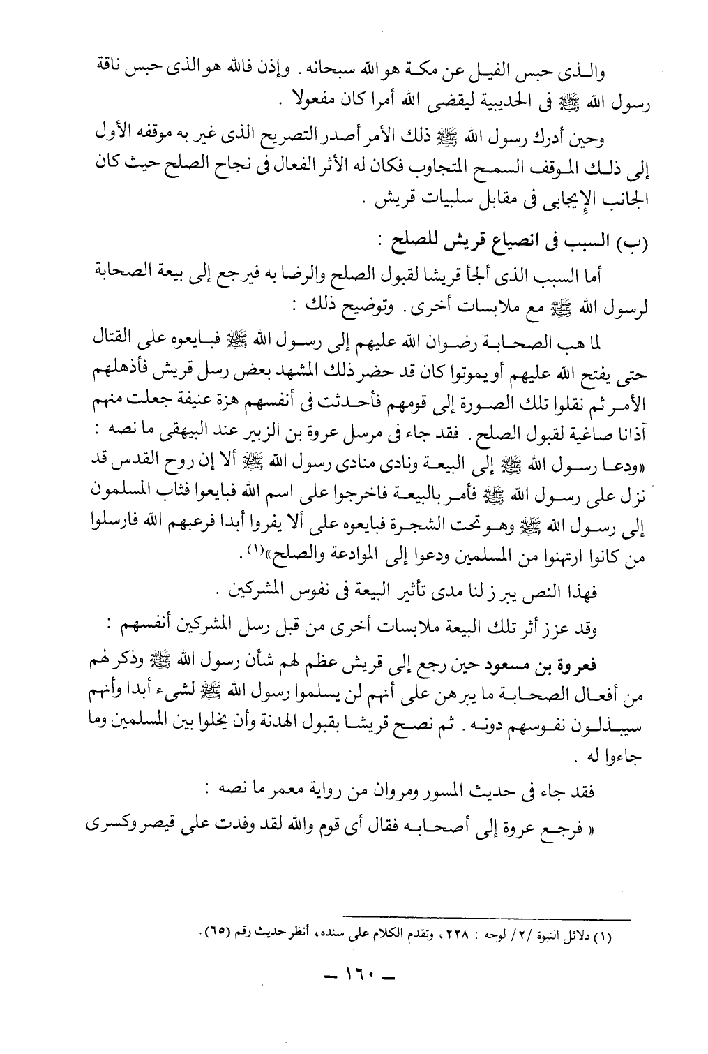 فعروة بن مسعود حين رجع إلى قريش عظم لهم شأن رسول الله صلى الله عليه وسلم وذكره لهم من أفعال الصحابة ما يبرهن على أنهم لن يسلموا رسول الله صلى الله عليه وسلم لشيء أبداً وأنهم سيبذلون نفوسهم دونه، ثم نصح قريشاً بقبول الهدنة، وأن يخلوا بين المسلمين وما جاءوا له.