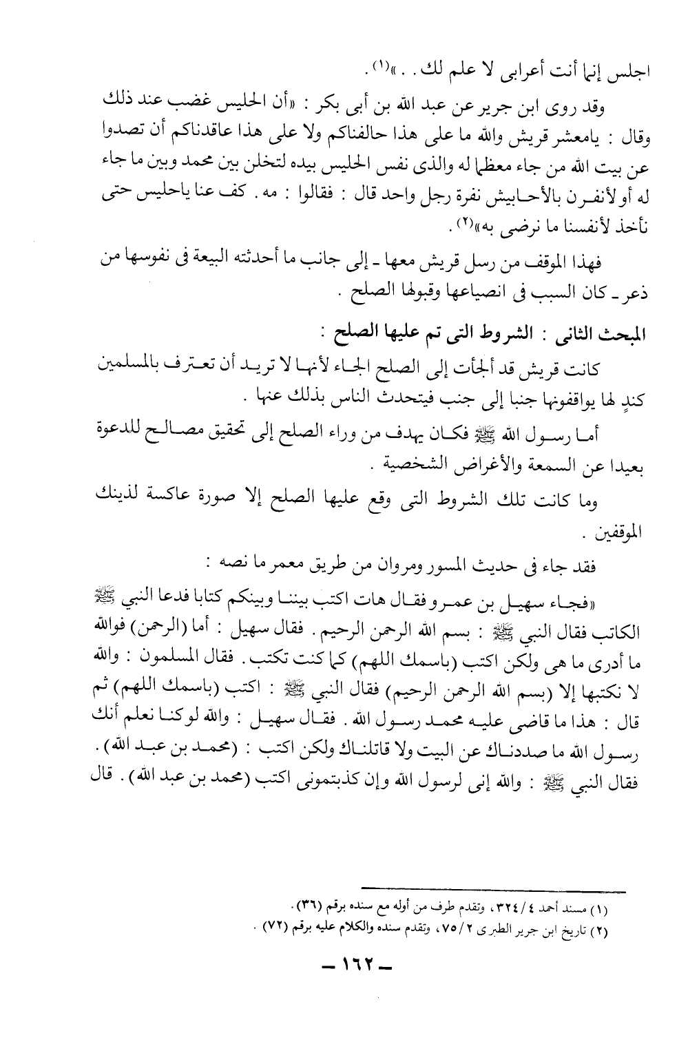 وقد روى ابن جرير عن عبد الله بن أبي بكر: "أن الحليس غضب عند ذلك، وقال: يا معشر قريش والله ما على هذا حالفناكم ولا على هذا عاقدناكم أن تصدوا عن بيت الله من جاء معظماً له، والذي نفس الحليس بيده لتخلن بين محمد وبين ما جاء له أو لأنفرن بالأحابيش نفرة رجل واحد، قال: فقالوا: مه، كف عنا يا حليس حتى نأخذ لأنفسنا ما نرضى به"2.
