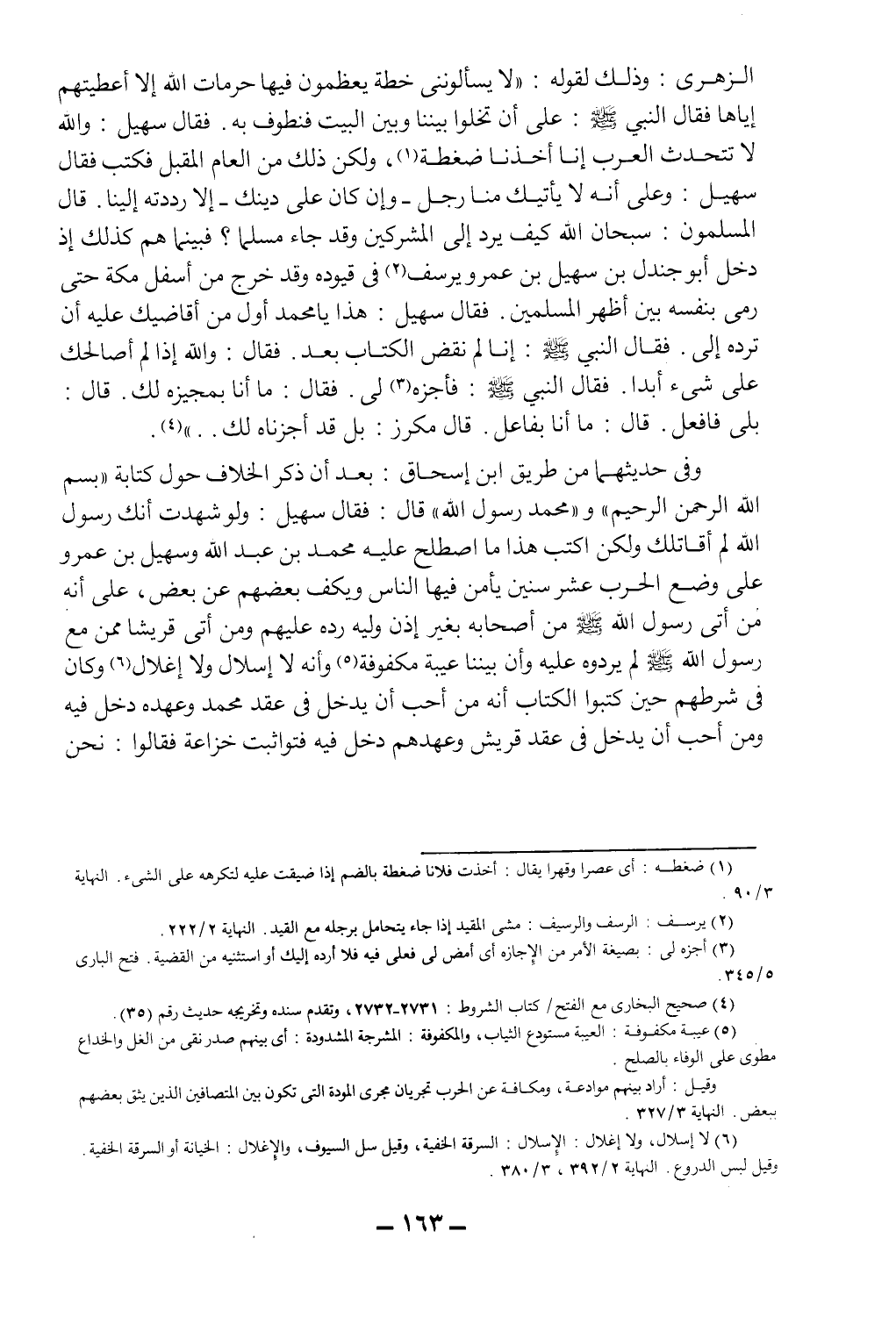 الزهري: وذلك لقوله: "لا يسألونني خطة يعظمون فيها حرمات الله إلا أعطيتهم إياها، فقال النبي صلى الله عليه وسلم: على أن تخلوا بيننا وبين البيت فنطوف به، فقال سهيل: والله لا تتحدث العرب إنا أخذنا ضغطة1، ولكن ذلك من العام المقبل، فكتب فقال سهيل: وعلى أنه لا يأتيك منا رجل - وإن كان على دينك - إلا رددته إلينا، قال المسلمون: سبحان الله كيف يرد إلى المشركين وقد جاء مسلماً؟ فبينما هم كذلك إذ دخل أبو جندل بن سهيل بن عمرو يرسف2 في قيوده وقد خرج من أسفل مكة حتى رمى بنفسه بين أظهر المسلمين، فقال سهيل: هذا يا محمد أول من أقاضيك عليه أن ترده إلي، فقال النبي صلى الله عليه وسلم: إنا لم نقض الكتاب بعد، فقال: والله إذا لم أصالحك على شيء أبداً، فقال النبي صلى الله عليه وسلم: فأجزه3 لي، فقال: ما أنا بمجيزه لك، قال: بلى فافعل، قال: ما أنا بفاعل، قال مكرز: بل قد أجزناه لك ... " 4.