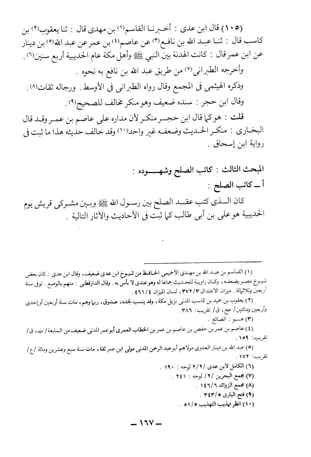 (105) قال ابن عدي: أخبرنا القاسم1 بن مهدي قال: ثنا يعقوب2 بن كاسب قال: ثنا عبد الله بن نافع3 عن عاصم4 بن عمر عن عبد الله5 بن دينار عن ابن عمر قال: كانت الهدنة بين النبي صلى الله عليه وسلم وأهل مكة عام الحديبية أربع سنين6.