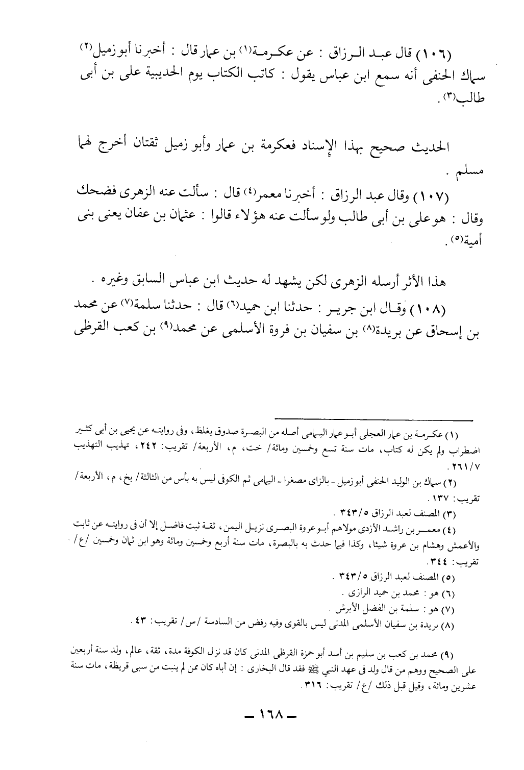 (106) قال عبد الرزاق: عن عكرمة1 بن عمار قال: أخبرنا أبو زميل2 سماك الحنفي أنه سمع ابن عباس يقول: كاتب الكتاب يوم الحديبية علي بن أبي طالب3.