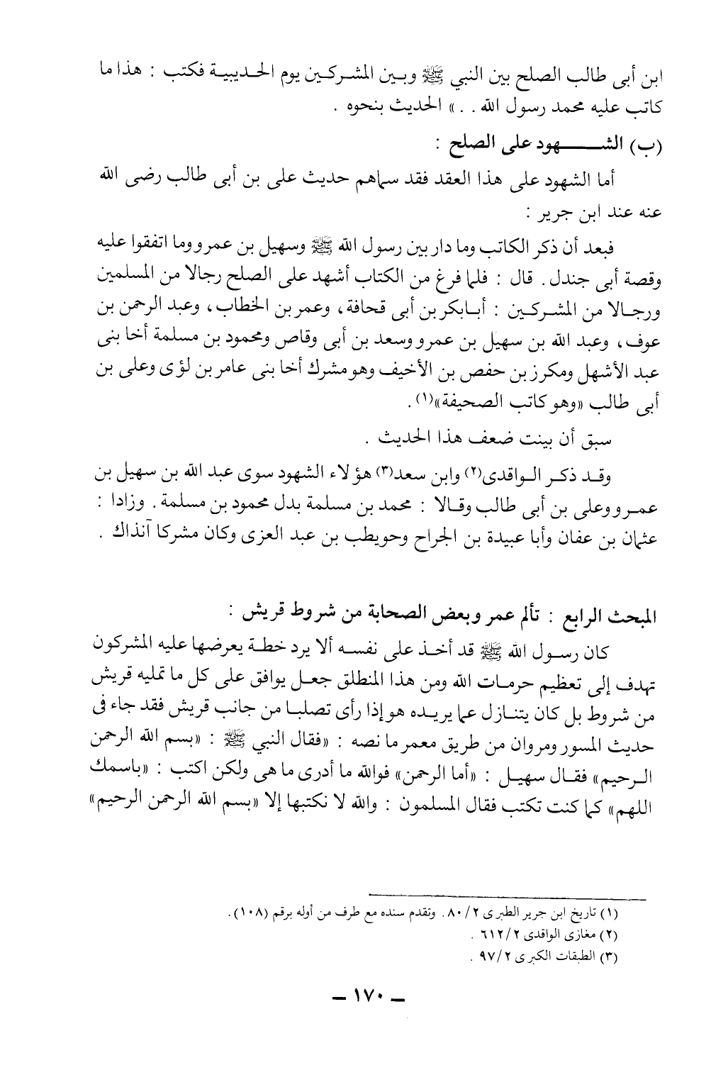 وقد ذكر الواقدي2 وابن سعد3 هؤلاء الشهود سوى عبد الله بن سهيل بن عمرو وعلي بن أبي طالب، وقالا: محمد بن مسلمة بدل محمود بن مسلمة، وزادا: عثمان بن عفان وأبا عبيدة بن الجراح، وحويطب بن عبد العزى وكان مشركاً آنذاك.