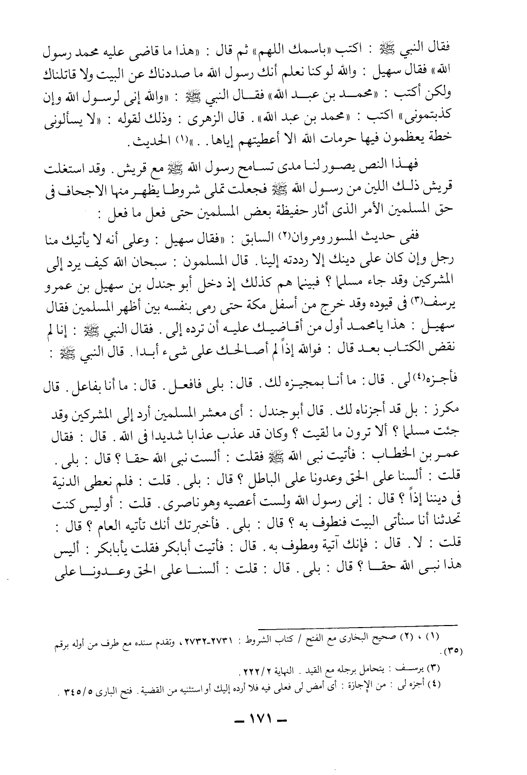 فقال النبي صلى الله عليه وسلم: اكتب "باسمك اللهم" ثم قال: "هذا ما قاضى عليه محمد رسول الله" فقال سهيل: والله لو كنا نعلم أنك رسول الله ما صددناك عن البيت، ولا قاتلناك، ولكن أكتب: "محمد بن عبد الله" فقال النبي صلى الله عليه وسلم: "والله إني لرسول الله وإن كذبتموني" اكتب "محمد بن عبد الله"، قال الزهري: وذلك لقوله: "لا يسألوني خطة يعظمون فيها حرمات الله إلا أعطيتهم إياها ... "1 الحديث.