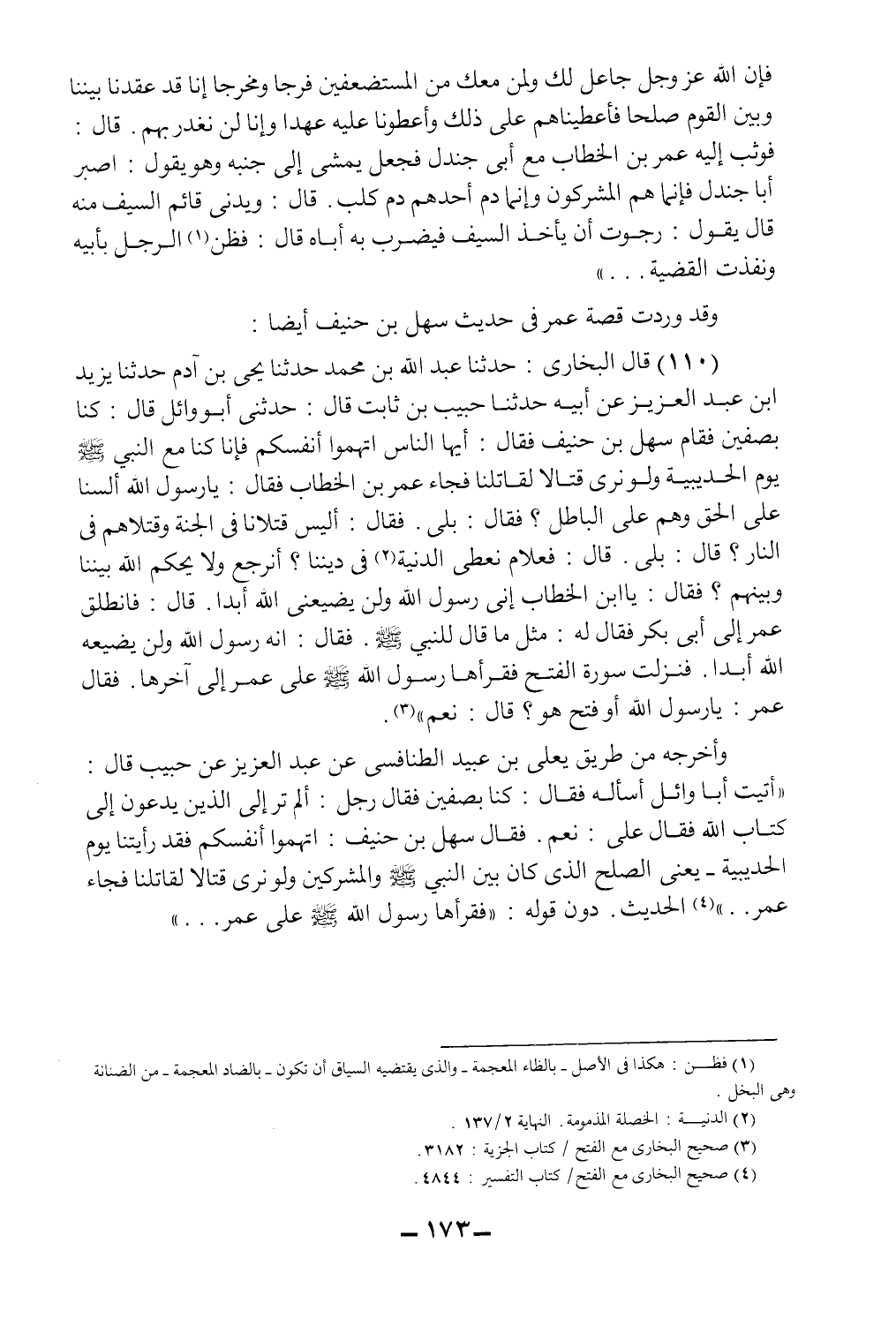 (110) قال البخاري: حدثنا عبد الله بن محمد حدثنا يحيى بن آدم حدثنا يزيد بن عبد العزيز عن أبيه حدثنا حبيب بن ثابت قال: حدثني أبو وائل قال: كنا بصفين فقام سهل بن حنيف فقال: أيها الناس اتهموا أنفسكم فإنا كنا مع النبي صلى الله عليه وسلم يوم الحديبية، ولو نرى قتالاً لقاتلنا، فجاء عمر بن الخطاب فقال: يا رسول الله ألسنا على الحق وهم على الباطل؟ فقال: بلى، فقال: أليس قتلانا في الجنة وقتلاهم في النار؟ قال: بلى، قال: فعلام نعطي الدنية2 في ديننا؟ أنرجع ولا يحكم الله بيننا وبينهم؟ فقال: يا ابن الخطاب إني رسول الله ولن يضيعني الله أبداً، قال: فانطلق عمر إلى أبي بكر فقال له: مثل ما قال للنبي صلى الله عليه وسلم، فقال: إنه رسول الله ولن يضيعه الله أبداً، فنزلت سورة الفتح، فقرأها رسول الله صلى الله عليه وسلم على عمر إلى آخرها، فقال عمر: يا رسول الله أو فتح هو؟ قال: نعم"3.