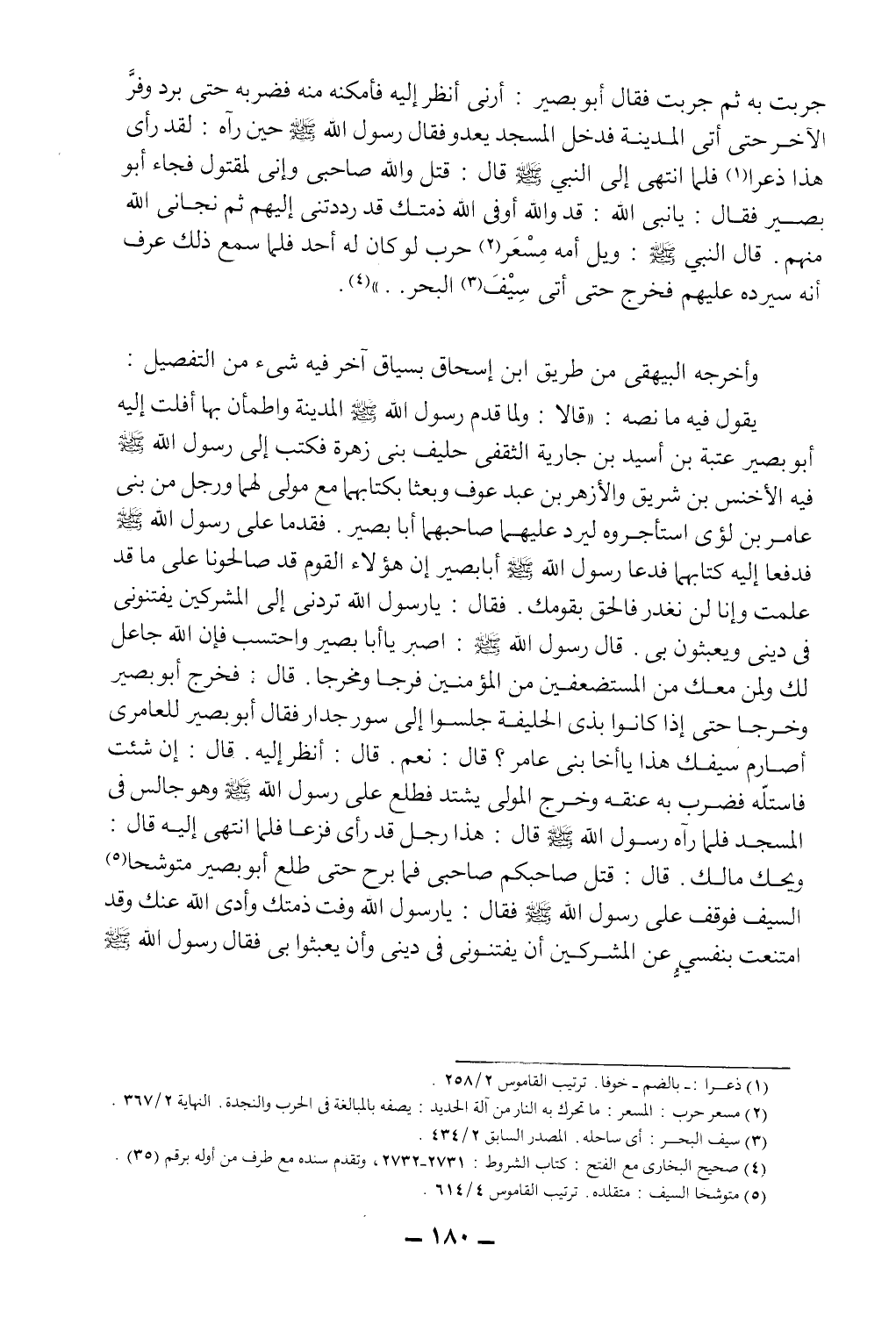 يقول فيه ما نصه: "قالا: ولما قدم رسول الله صلى الله عليه وسلم المدينة واطمأن بها، أفلت إليه أبو بصيرة عتبة بن أسيد بن جارية الثقفي حليف بني زهرة، فكتب إلى رسول الله صلى الله عليه وسلم فيه الأخنس بن شريق والأزهر بن عبد عوف وبعثا بكتابهما مع مولى لهما ورجل من بني عامر بن لؤي استأجروه ليرد عليهما صاحبهما أبا بصير، فقدما على رسول الله صلى الله عليه وسلم فدفعا إليه كتابهما فدعا رسول الله صلى الله عليه وسلم أبا بصير إن هؤلاء القوم قد صالحونا على ما قد علمت، وإنا لن نغدر فالحق بقومك، فقال: يا رسول الله تردني إلى المشركين يفتنوني في ديني ويعبثون بي، قال رسول الله صلى الله عليه وسلم: اصبر يا أبا بصير، واحتسب، فإن الله جاعل لك ولمن معك من المستضعفين من المؤمنين فرجاً ومخرجاً، قال: فخرج أبو بصير وخرجا حتى إذا كانوا بذي الحليفة جلسوا إلى سور جدار فقال أبو بصير للعامري أصارم سيفك هذا يا أخا بني عامر؟ قال: نعم، قال أنظر إليه، قال إن شئت، فاستلّه فضرب به عنقه وخرج المولى يشتد فطلع على رسول الله صلى الله عليه وسلم وهو جالس في المسجد، فلما رآه رسول الله صلى الله عليه وسلم قال: هذا رجل قد رأى فزعاً فلما انتهى إليه قال: ويحك مالك، قال: قتل صاحبكم صاحبي، فما برح حتى طلع أبو بصير متوشحاً5 السيف، فوقف على رسول الله صلى الله عليه وسلم فقال: يا رسول الله وفت ذمتك وأدى الله عنك، امتنعت بنفسي عن المشركين أن يفتنوني في ديني، وأن يعبثوا بي، فقال رسول الله صلى الله عليه وسلم