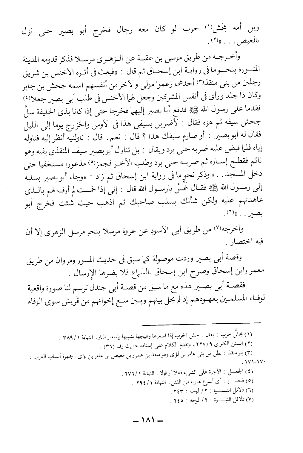 وأخرجه من طريق موسى بن عقبة عن الزهري مرسلاً فذكر قدومه المدينة المنورة بنحو ما في رواية ابن إسحاق ثم قال: "فبعث في أثره الأخنس بن شريق في رجلين من بني منقذ3 أحدهما زعموا مولى، والآخر من أنفسهم اسمه جحش بن جابر وكان ذا جلد ورأي في أنفس المشركين، وجعل لهما الأخنس في طلب أبي بصير جعلاً4، فقدما على رسول الله صلى الله عليه وسلم فدفع أبا بصير إليهما فخرجا حتى إذا كانا بذي الحليفة سلّ جحش سيفه ثم هزه فقال: لأضربن بسيفي هذا في الأوس والخزرج يوماً إلى الليل، فقال له أبو بصير: أو صارم سيفك هذا؟ قال: نعم، قال: ناولنيه أنظر إليه، فناوله إليه فلما قبض عليه ضربه حتى برد، ويقال: بل تناول أبو بصير سيف المنقذي بفيه وهو نائم فقطع إساره ثم ضربه حتى برد وطلب الآخر فجمز5 مذعوراً مستخفياً حتى دخل المسجد ... " وذكر نحو ما في رواية ابن إسحاق ثم زاد: "وجاء أبو بصير بسلبه إلى رسول الله فقال خَمِّسْ يا رسول الله قال: إني إذا خمست لم أوف لهم بالذي عاهدتهم عليه، ولكن شأنك بسلب صاحبك، ثم اذهب حيث شئت، فخرج أبو بصير ... "6.