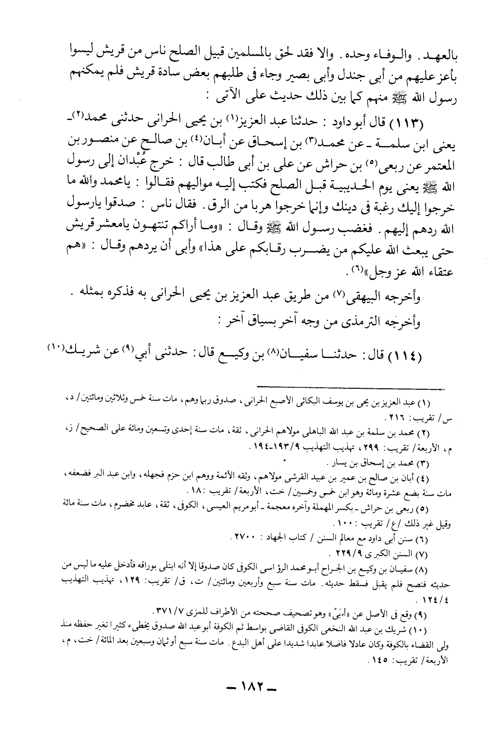 (113) قال أبو داود: حدثنا عبد العزيز1 بن يحيى الحراني حدثني محمد2 - يعني ابن سلمة - عن محمد3 بن إسحاق عن أبان4 بن صالح عن منصور بن المعتمر عن ربعي5 بن حراش عن علي بن أبي طالب قال: خرج عُبْدان إلى رسول الله صلى الله عليه وسلم يعني يوم الحديبية، قبل الصلح فكتب إليه مواليهم فقالوا: يا محمد والله ما خرجوا إليك رغبة في دينك، وإنما خرجوا هرباً من الرق، فقال ناس: صدقوا يا رسول الله ردهم إليهم، فغضب رسول الله صلى الله عليه وسلم وقال: "وما أراكم تنتهون يا معشر قريش حتى يبعث الله عليكم من يضرب رقابكم على هذا"، وأبى أن يردهم وقال: "هم عتقاء الله عز وجل"6.