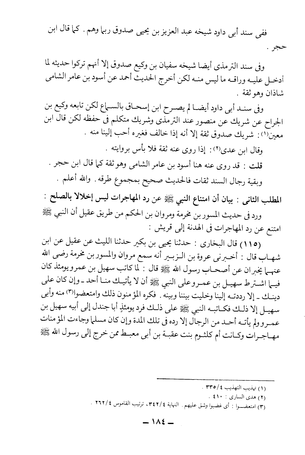 (115) قال البخاري: حدثنا يحيى بن بكير حدثنا الليث عن عقيل عن ابن شهاب قال: أخبرني عروة بن الزبير أنه سمع مروان والمسور بن مخرمة رضي الله عنهما يخبران عن أصحاب رسول الله صلى الله عليه وسلم قال: لما كاتب سهيل بن عمرو يومئذ كان فيما اشترط سهيل بن عمرو على النبي صلى الله عليه وسلم أن لا يأتيك منا أحد - وإن كان على دينك - إلا رددته إلينا، وخليت بيننا وبينه، فكره المؤمنون ذلك وامتعضوا1 منه، وأبى سهيل إلا ذلك، فكاتبه النبي صلى الله عليه وسلم على ذلك فرد يومئذ أبا جندل إلى أبيه سهيل بن عمرو، ولم يأته أحد من الرجال إلا رده في تلك المدة، وإن كان مسلماً وجاءت المؤمنات مهاجرات وكانت أم كلثوم بنت عقبة بن أبي معيط ممن خرج إلى رسول الله صلى الله عليه وسلم