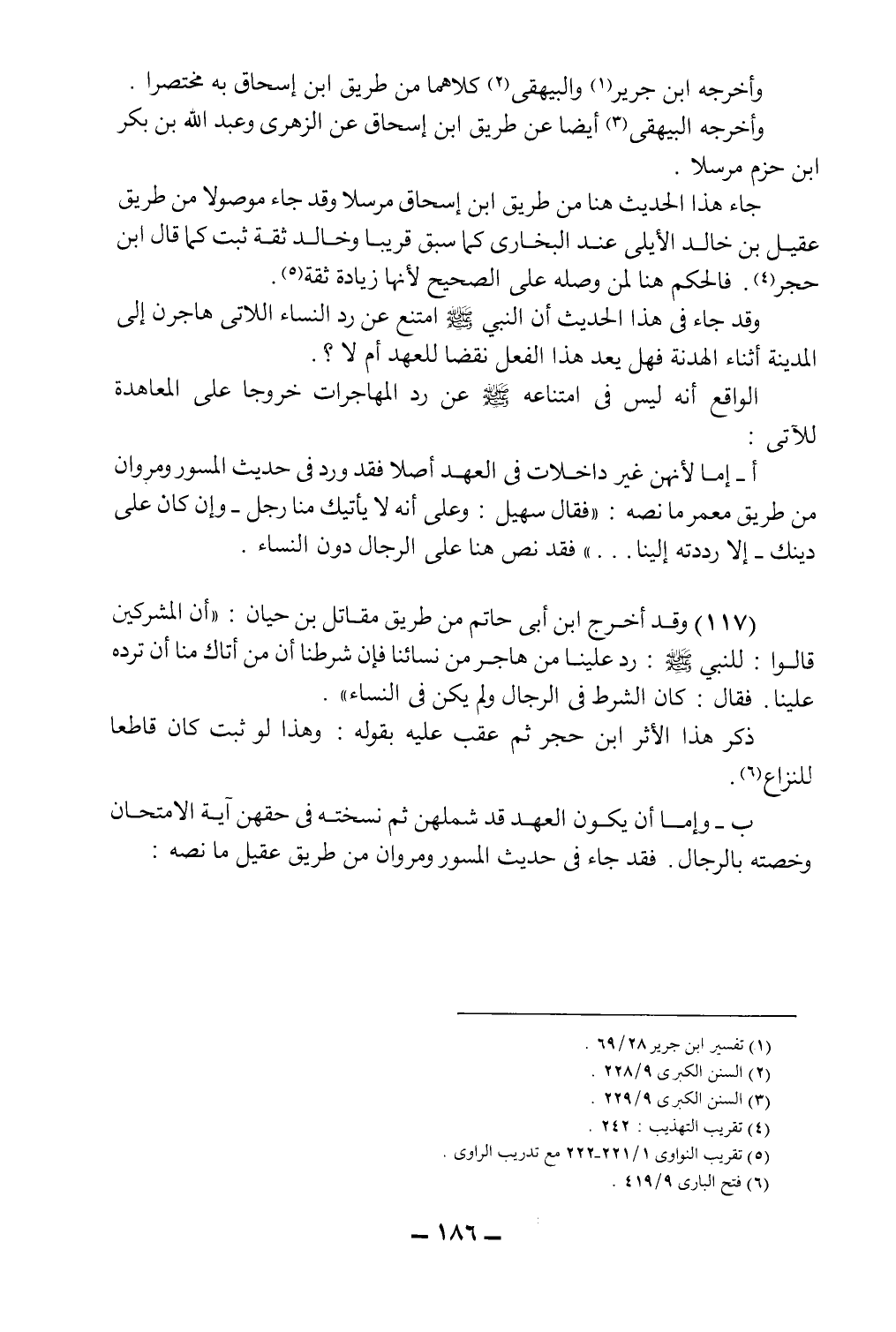ب - وإما أن يكون العهد قد شملهن ثم نسخته في حقهن آية الامتحان وخصته بالرجال، فقد جاء في حديث المسور ومروان من طريق عقيل ما نصه: