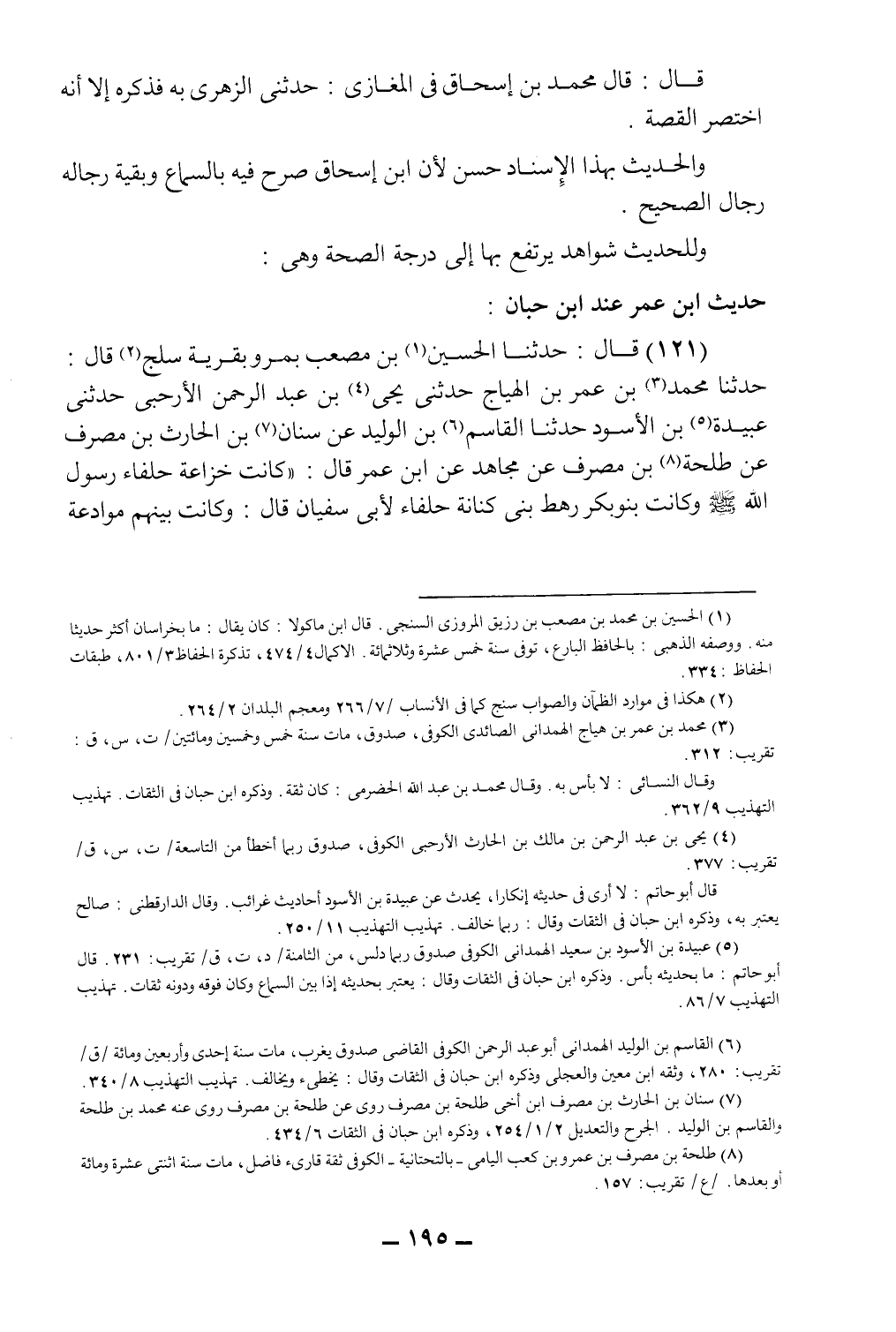 (121) قال: حدثنا الحسين1 بن مصعب بمرو بقرية سلج2، قال: حدثنا محمد3 بن عمر بن الهياج، حدثني يحيى4 بن عبد الرحمن الأرحبي حدثني عبيدة5 بن الأسود حدثنا القاسم6 بن الوليد عن سنان7 بن الحارث بن مصرف عن طلحة8 بن مصرف عن مجاهد عن ابن عمر قال: "كانت خزاعة حلفاء رسول الله صلى الله عليه وسلم، وكانت بنو بكر رهط بني كنانة حلفاء لأبي سفيان، قال: وكانت بينهم موادعة