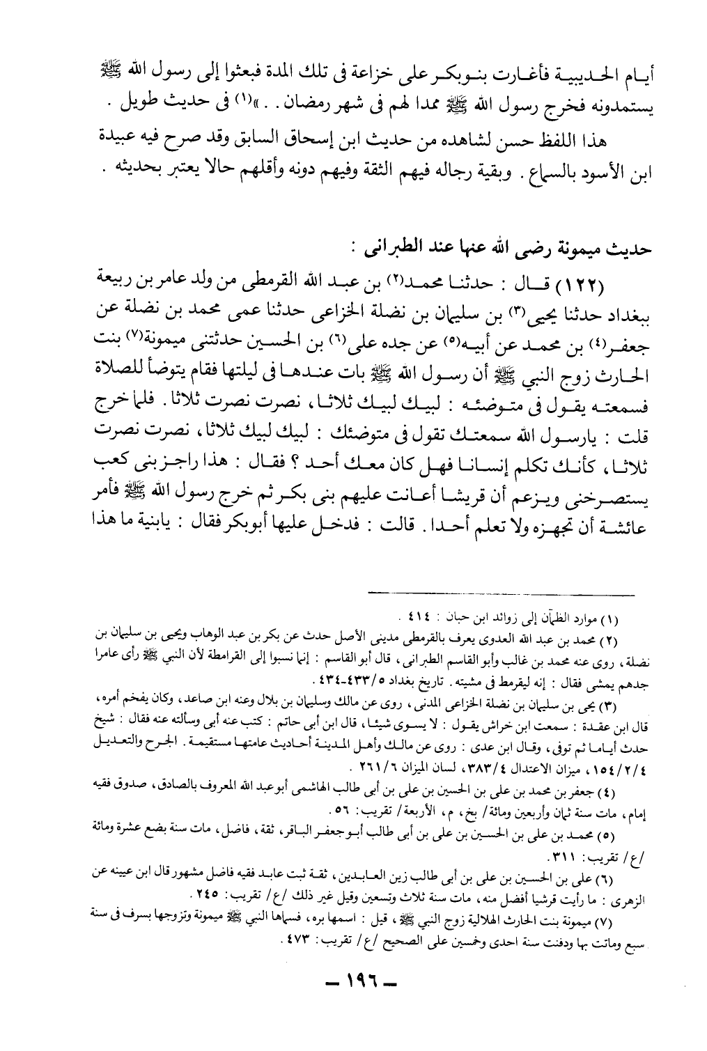 (122) قال: حدثنا محمد2 بن عبد الله القرمطي من ولد عامر بن ربيعة ببغداد، حدثنا يحيى3 بن سليمان بن نضلة الخزاعي حدثنا عمي محمد بن نضلة عن جعفر4 بن محمد عن أبيه5 عن جده علي6 بن الحسين، حدثتني ميمونة7 بنت الحارث، زوج النبي صلى الله عليه وسلم أن رسول الله صلى الله عليه وسلم بات عندها في ليلتها فقام يتوضأ للصلاة فسمعته يقول في متوضئه: ليبك لبيك ثلاثاً، نصرت نصرت ثلاثاً، فلما خرج قلت: يا رسول الله سمعتك تقول في متوضئك: ليبك لبيك ثلاثاً، نصرت نصرت ثلاثاَ، كأنك تكلم إنساناً فهل كان معك أحد؟ فقال: هذا راجز بني كعب يستصرخني ويزعم أن قريشاَ أعانت عليهم بني بكر، ثم خرج رسول الله صلى الله عليه وسلم فأمر عائشة أن تجهزه ولا تعلم أحداً، قالت: فدخل عليها أبو بكر فقال: يا بنية ما هذا