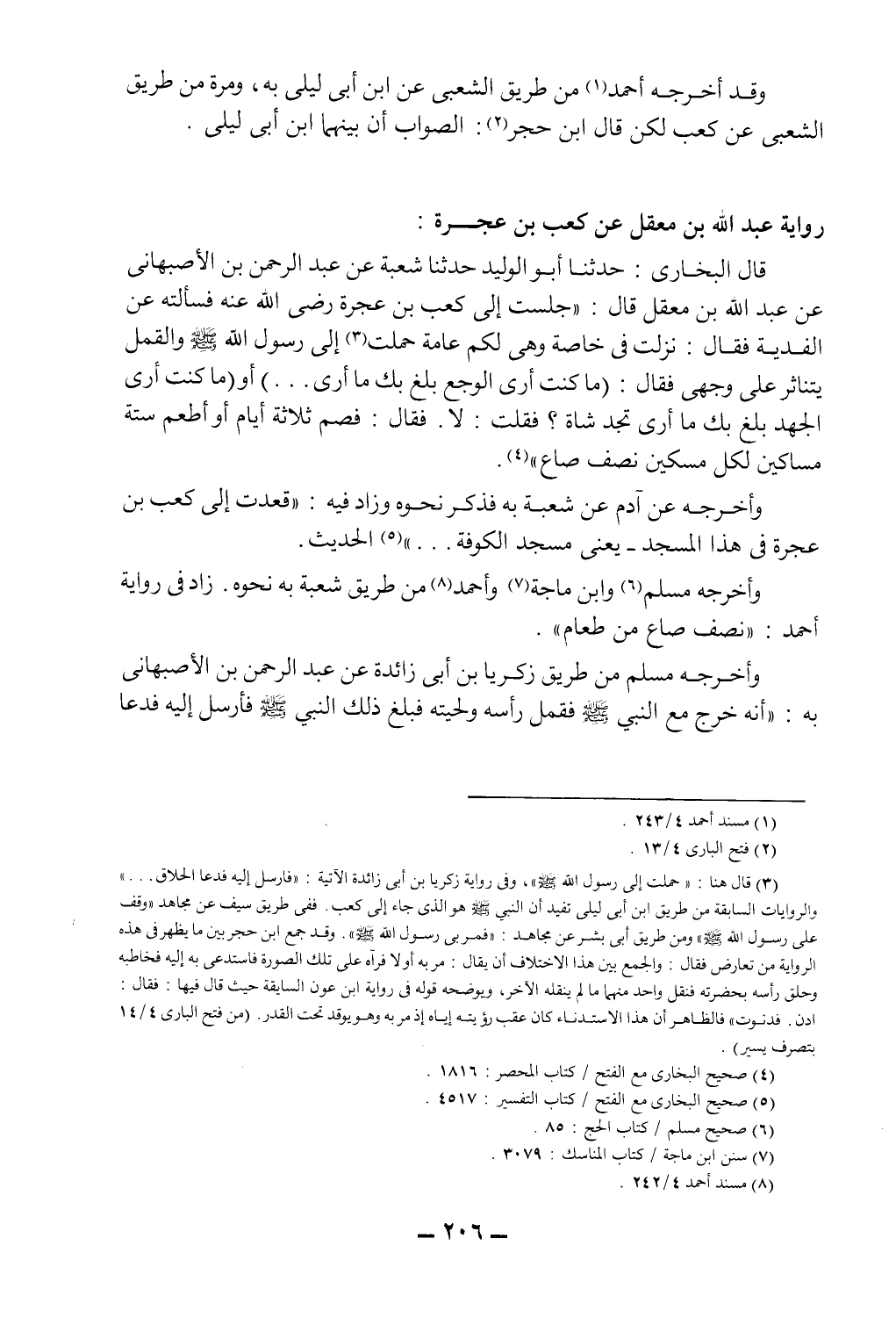 قال البخاري: حدثنا أبو الوليد حدثنا شعبة عن عبد الرحمن بن الأصبهاني عن عبد الله بن معقل قال: "جلست إلى كعب بن عجرة رضي الله عنه فسألته عن الفدية فقال: نزلت فيَّ خاصة وهي لكم عامة، حملت3 إلى رسول الله صلى الله عليه وسلم والقمل يتناثر على وجهي، فقال: "ما كنت أرى الوجع بلغ بك ما أرى ... " أو "ما كنت أرى الجهد بلغ بك ما أرى تجد شاة؟ فقلت: لا، فقال: فصم ثلاثة أيام أو أطعم ستة مساكين لكل مسكين نصف صاع"4.