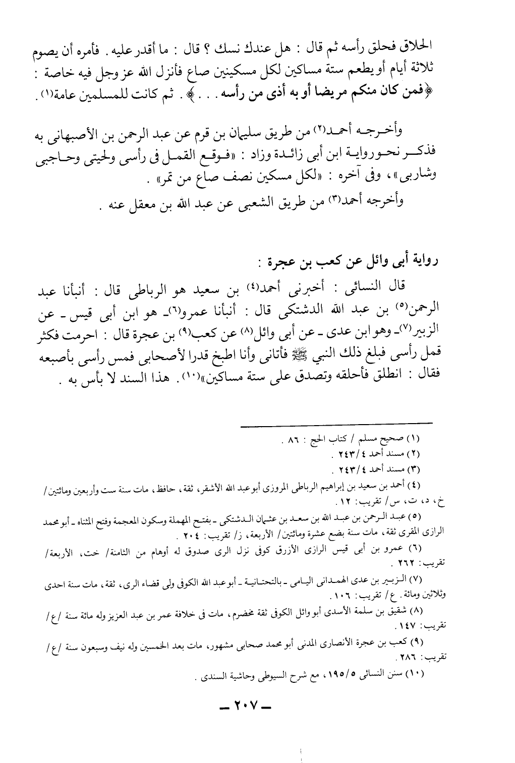 قال النسائي: أخبرني أحمد4 بن سعيد هو الرباطي قال: أنبأنا عبد الرحمن5 بن عبد الله الدشتكي، قال: أنبأنا عمرو6 - هو ابن أبي قيس - عن الزبير7 - وهو ابن عدي - عن أبي وائل8 عن كعب9 بن عجرة قال: أحرمت فكثر قمل رأسي، فبلغ ذلك النبي صلى الله عليه وسلم فأتاني وأنا أطبخ قدراً لأصحابي، فمس رأسي بإصبعه فقال: "انطلق فاحلقه وتصدق على ستة مساكين" 10، هذا السند لا بأس به.