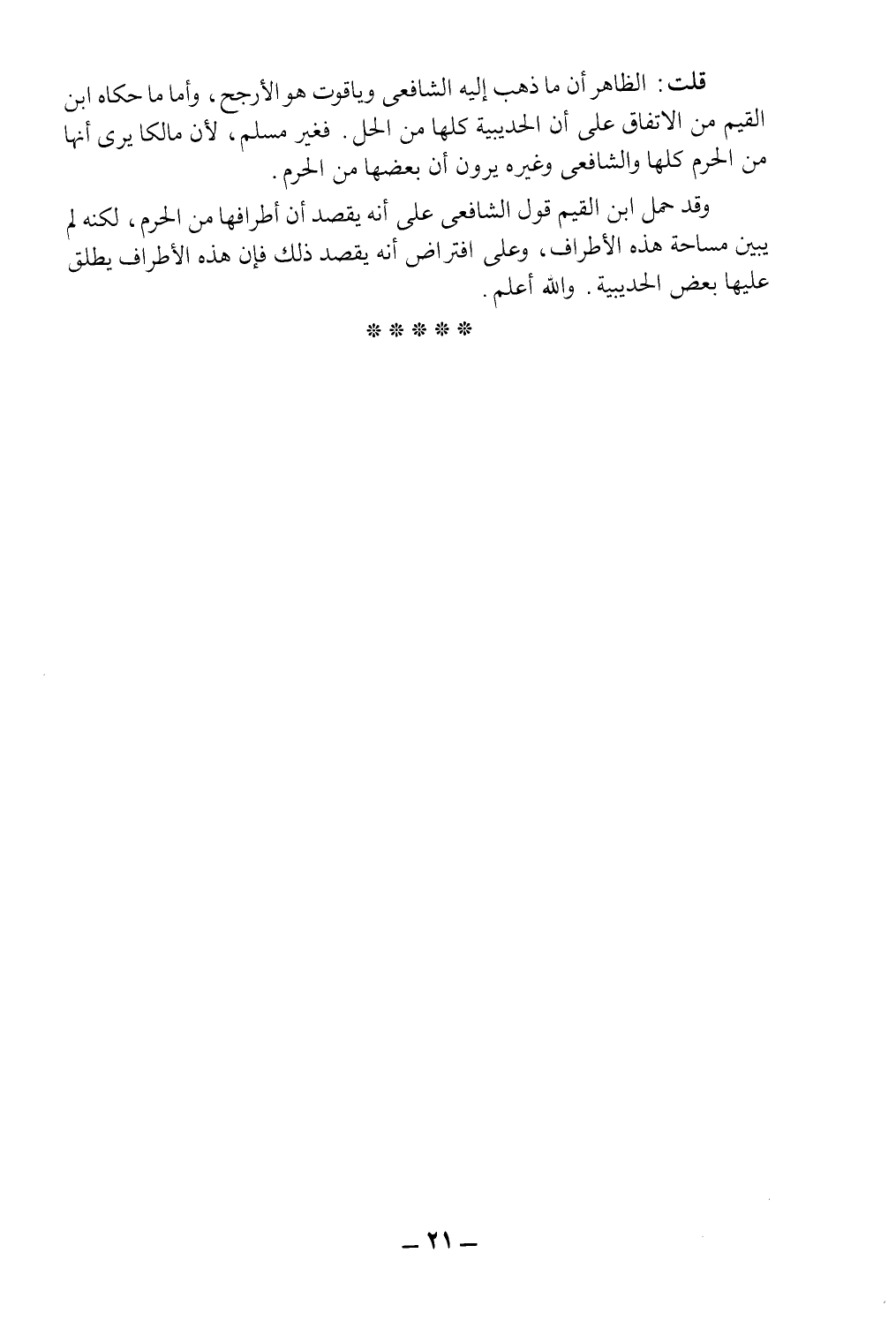 قلت: الظاهر أن ما ذهب إليه الشافعي وياقوت هو الأرجح، وأما ما حكاه ابن القيم من الاتفاق على أن الحديبية كلها من الحل، فغير مسلم، لأن مالكاً يرى أنها من الحرم كلها، والشافعي وغيره يرون أن بعضها من الحرم.