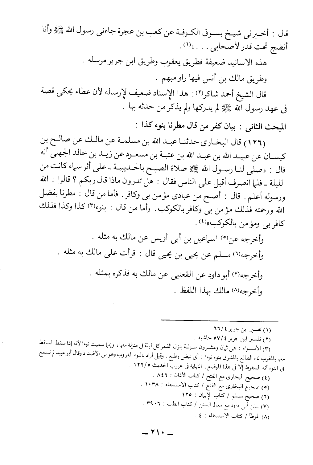 (126) قال البخاري: حدثنا عبد الله بن مسلمة عن مالك عن صالح بن كيسان عن عبيد الله بن عبد الله بن عتبة بن مسعود عن زيد بن خالد الجهني أنه قال: "صلى لنا رسول الله صلى الله عليه وسلم صلاة الصبح بالحديبية - على أثر سماء كانت من الليلة - فلما انصرف أقبل على الناس فقال: هل تدرون ماذا قال ربكم؟ قالوا: الله ورسوله أعلم، قال: أصبح من عبادي مؤمن بي وكافر، فأما من قال: مطرنا بفضل الله ورحمته، فذلك مؤمن بي كافر بالكوكب، وأما من قال: بنوء1 كذا وكذا، فذلك كافر بي ومؤمن بالكوكب"2.