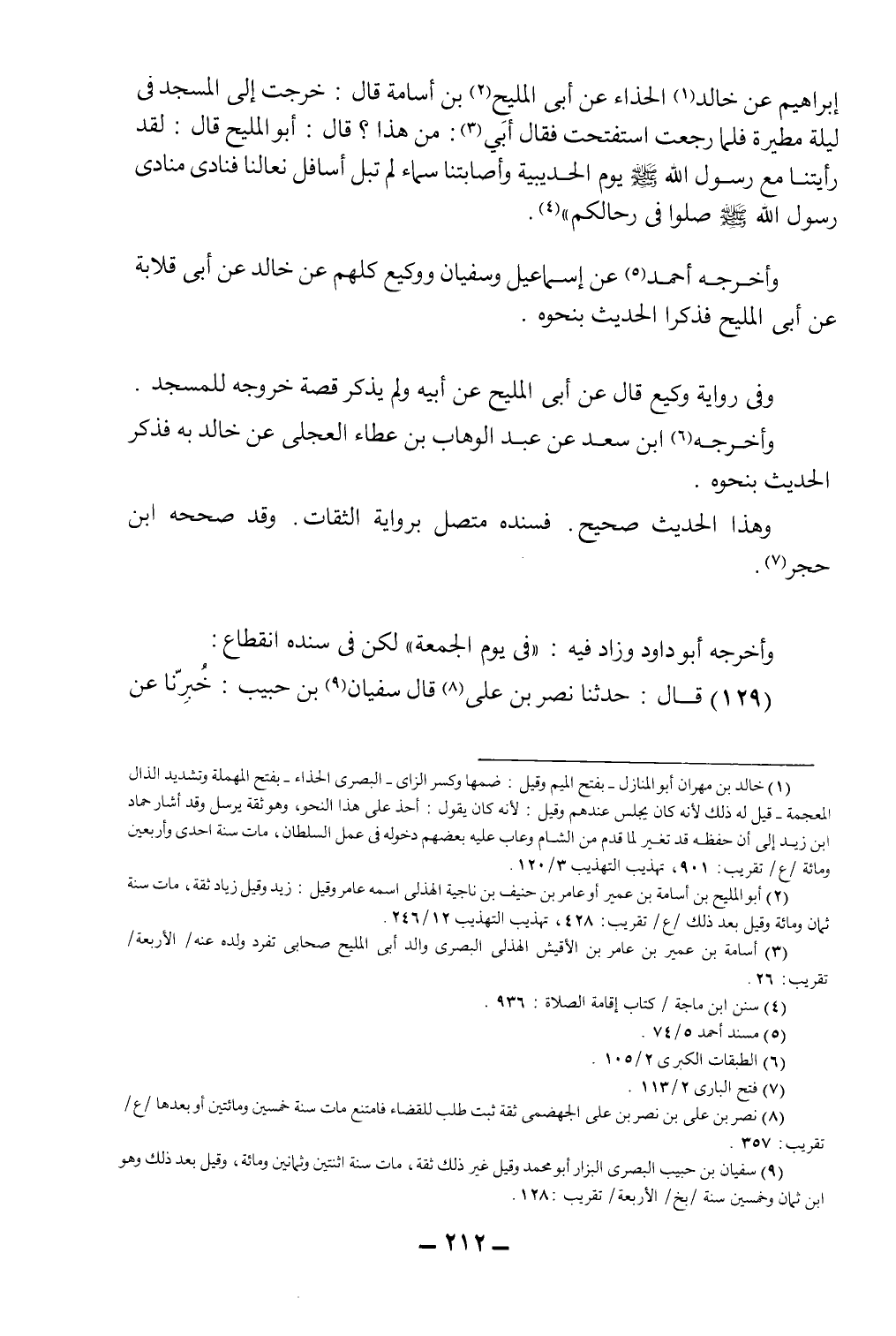 إبراهيم عن خالد1 الحذاء عن أبي المليح2 بن أسامة قال: خرجت إلى المسجد في ليلة مطيرة فلما رجعت استفتحت فقال أبي3: من هذا؟ قال: أبو المليح، قال: لقد رأيتنا مع رسول الله صلى الله عليه وسلم يوم الحديبية وأصابتنا سماء لم تبل أسافل نعالنا، فنادى منادي رسول الله صلى الله عليه وسلم: "صلوا في رحالكم"4.