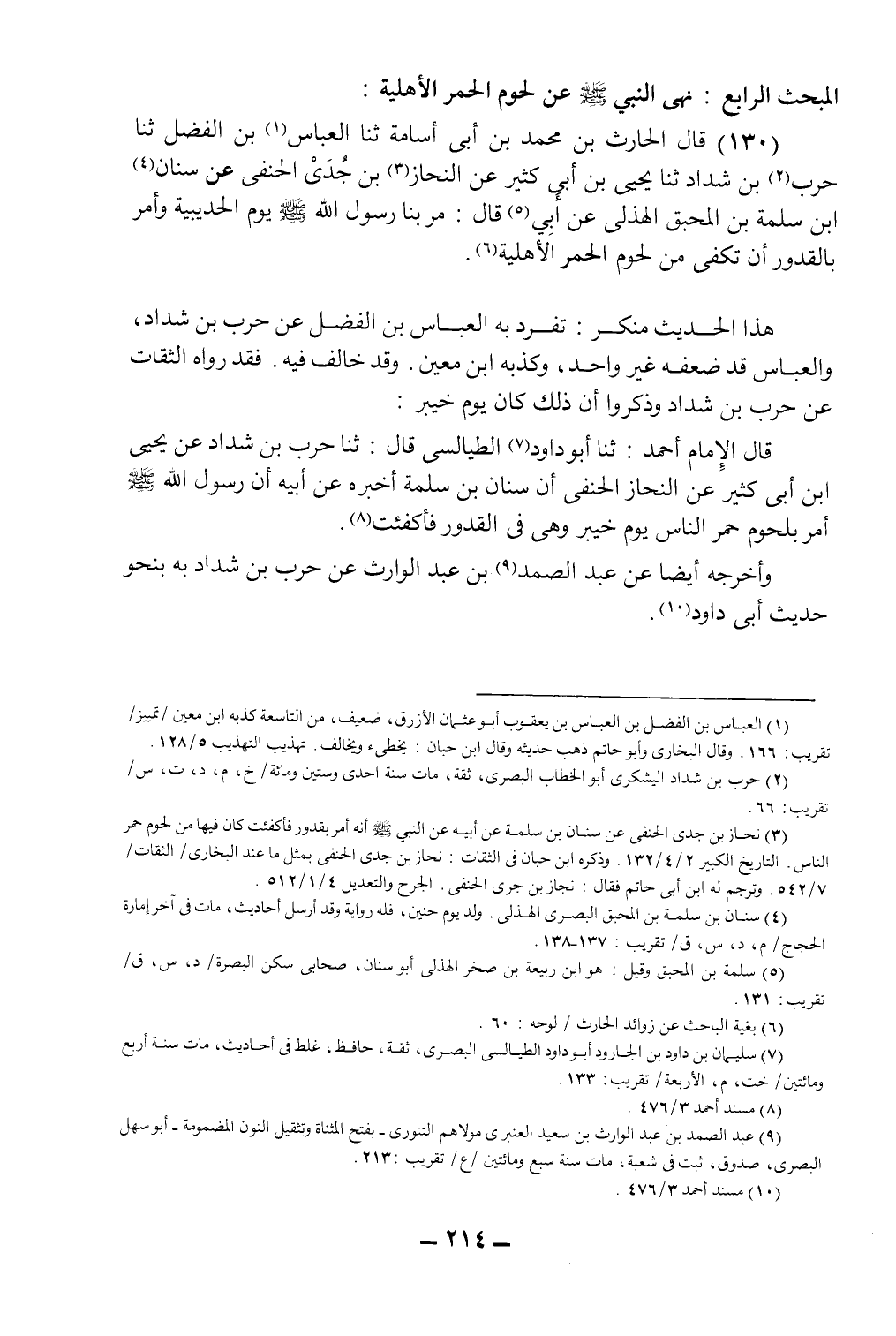 (130) قال الحارث بن محمد بن أبي أسامة ثنا العباس1 بن الفضل ثنا حرب2 بن شداد ثنا يحيى بن أبي كثير عن النحاز3 بن جُدَىْ الحنفي عن سنان4 بن سلمة بن المحبق الهذلي عن أبي5 قال: مر بنا رسول الله صلى الله عليه وسلم يوم الحديبية وأمر بالقدور أن تكفأ من لحوم الحمر الأهلية6.