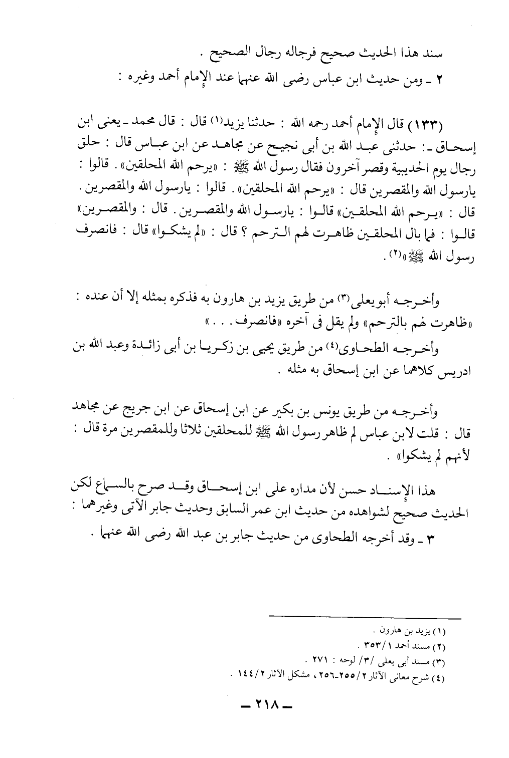 (133) قال الإمام أحمد رحمه الله: حدثنا يزيد1 قال: قال محمد - يعني ابن إسحاق -: حدثني عبد الله بن أبي نجيح عن مجاهد عن ابن عباس قال: حلق رجال يوم الحديبية وقصر آخرون، فقال رسول الله صلى الله عليه وسلم: "يرحم الله المحلقين"، قالوا: يا رسول الله والمقصرين، قال: "يرحم الله المحلقين"، قالوا: يا رسول الله والمقصرين، قال: "يرحم الله المحلقين" قالوا: يا رسول الله والمقصرين، قال: "والمقصرين"، قالوا: فما بال المحلقين ظاهرت لهم الترحم؟ قال: "لم يشكوا"، قال: فانصرف رسول الله صلى الله عليه وسلم"2.