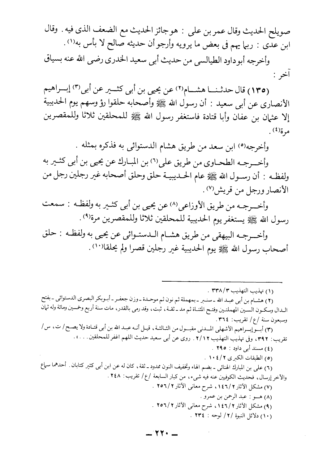 (135) قال: حدثنا هشام2 عن يحيى بن أبي كثير عن أبي إبراهيم3 الأنصاري عن أبي سعيد: أن رسول الله صلى الله عليه وسلم وأصحابه حلقوا رؤوسهم يوم الحديبية، إلا عثمان بن عفان وأبا قتادة فاستغفر رسول الله صلى الله عليه وسلم للمحلقين ثلاثاً وللمقصرين مرة4.