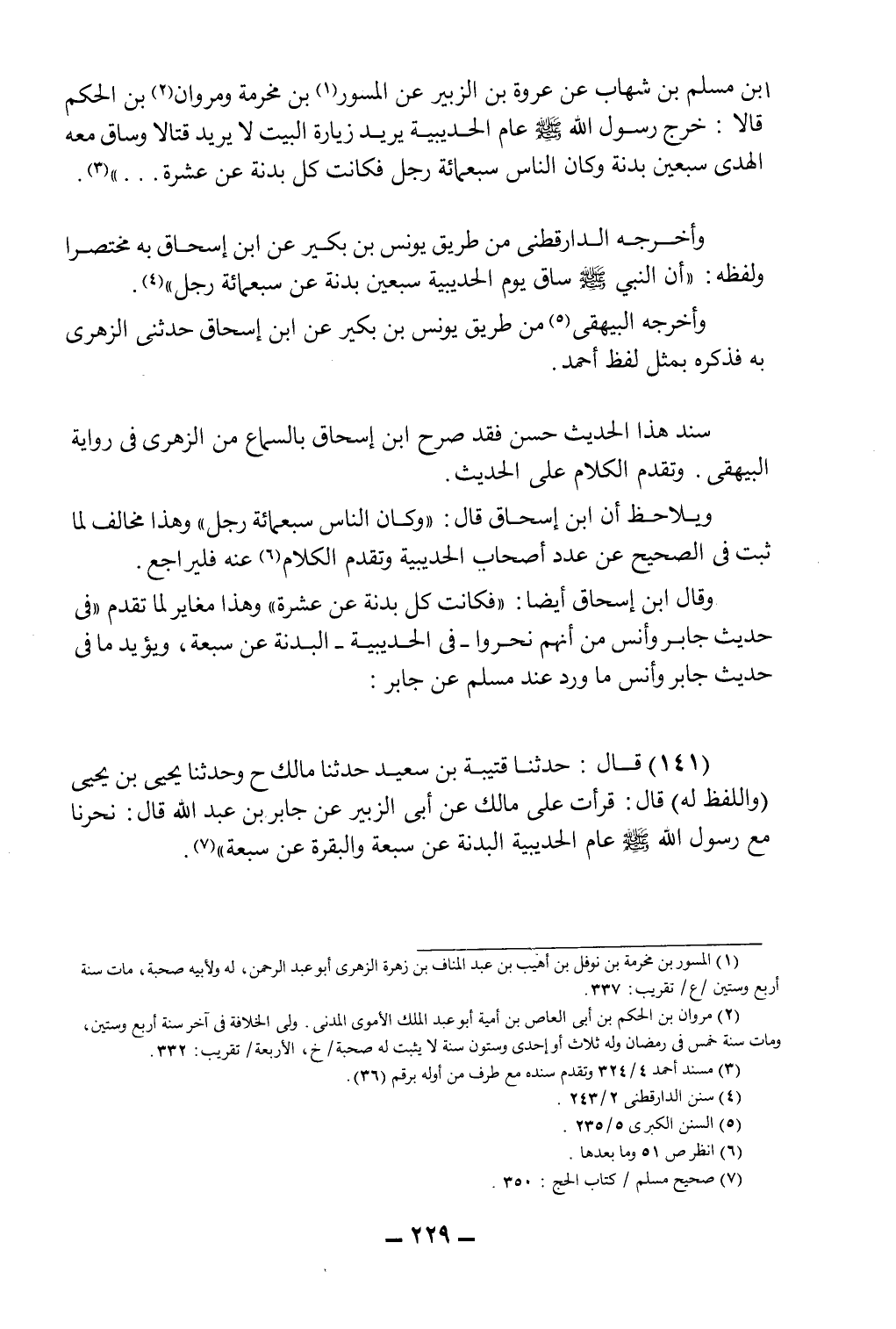 وأخرجه الدارقطني من طريق يونس بن بكير عن ابن إسحاق به مختصراً ولفظه: "أن النبي صلى الله عليه وسلم ساق يوم الحديبية سبعين بدنة عن سبعمائة رجل"4.