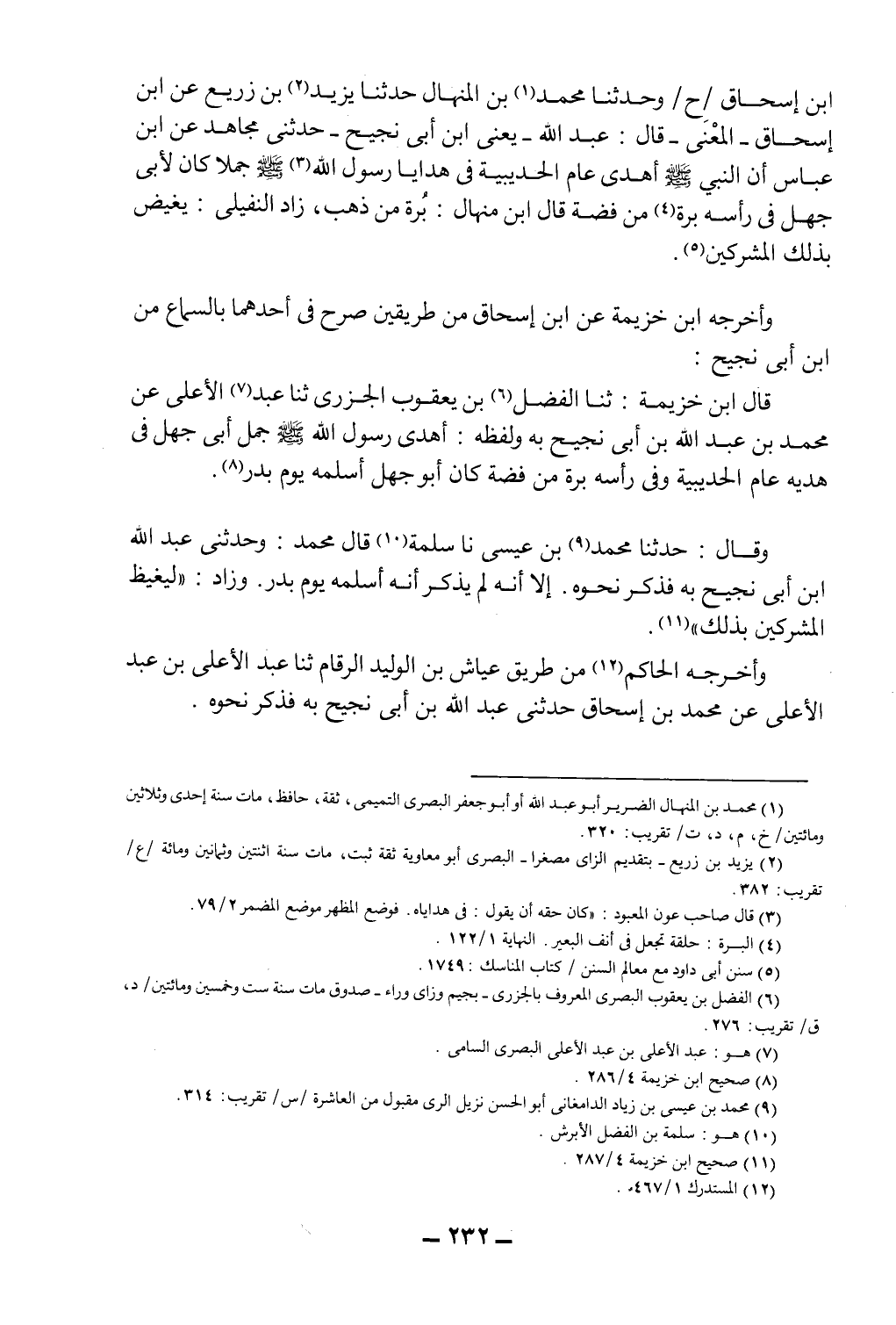 قال ابن خزيمة: ثنا الفضل6 بن يعقوب الجزري ثنا عبد الأعلى7 عن محمد بن عبد الله بن أبي نجيح به، ولفظه: أهدى رسول الله صلى الله عليه وسلم جمل أبي جهل في هديه عام الحديبية وفي رأسه برة من فضة، كان أبو جهل أسلمه يوم بدر8.