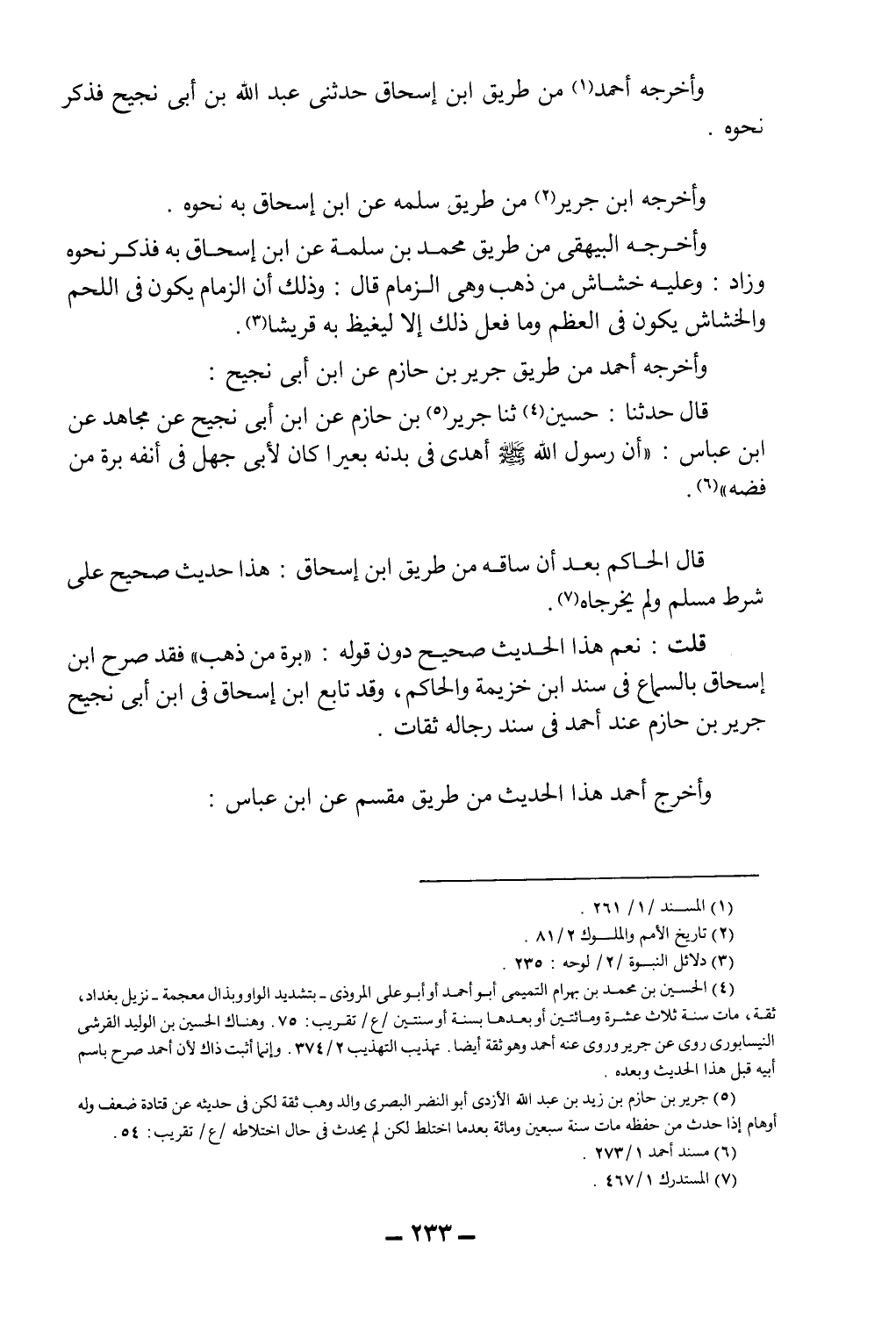 قال: حدثنا حسين4 ثنا جرير5 بن حازم عن ابن أبي نجيح عن مجاهد عن ابن عباس: "أن رسول الله صلى الله عليه وسلم أهدى في بدنه بعيراً كان لأبي جهل في أنفه برة من فضة"6.