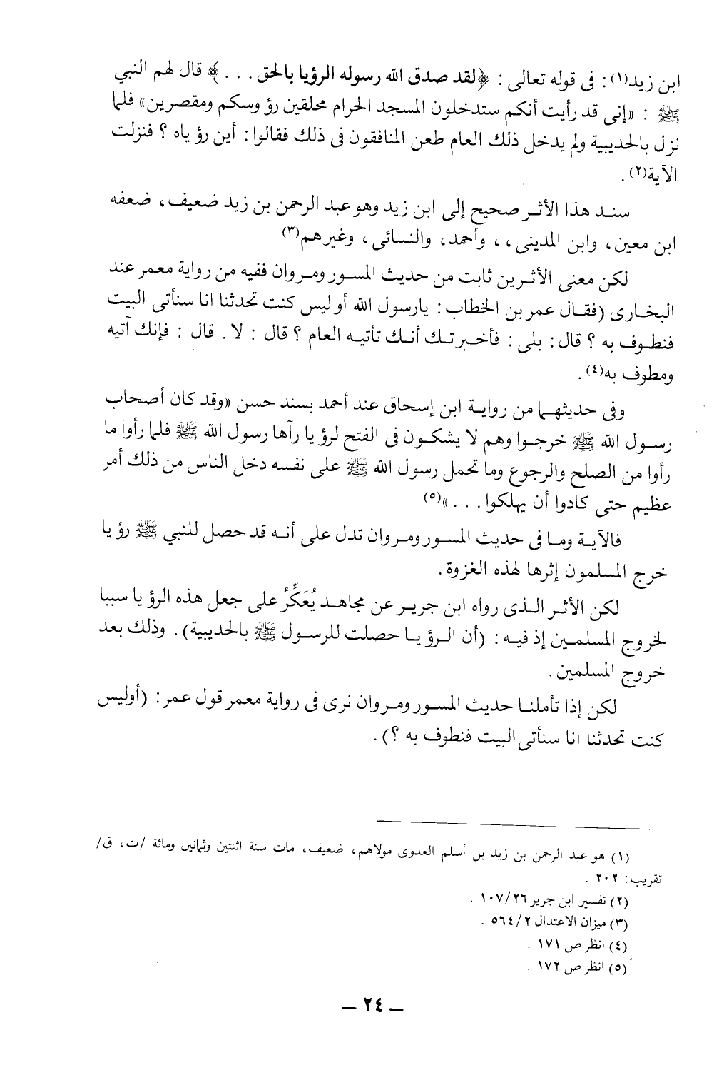 لكن معنى الأثرين ثابت من حديث المسور ومروان ففيه من رواية معمر عند البخاري: "فقال عمر بن الخطاب: يا رسول الله أو ليس كنت تحدثنا أنا سنأتي البيت فنطوف به؟ قال: بلى: فأخبرتك أنك تأتيه العام؟ قال: لا، قال: فإنك آتيه ومطوف به4.