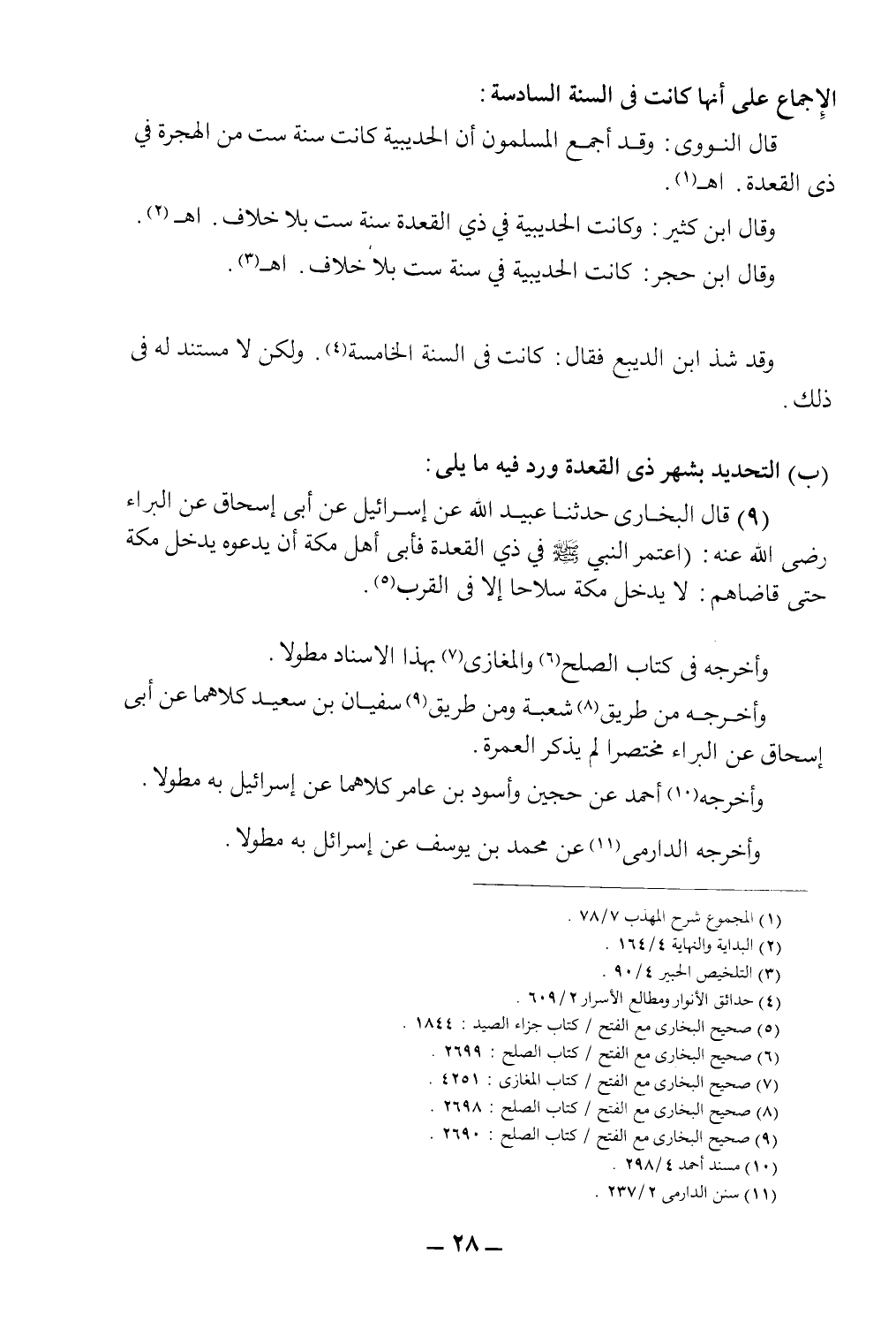 (9) قال البخاري حدثنا عبيد الله عن إسرائيل عن أبي إسحاق عن البراء رضي الله عنه: "اعتمر النبي صلى الله عليه وسلم في ذي القعدة، فأبى أهل مكة أن يدعوه يدخل مكة، حتى قاضاهم: لا يدخل مكة سلاحاً إلا في القرب"5.