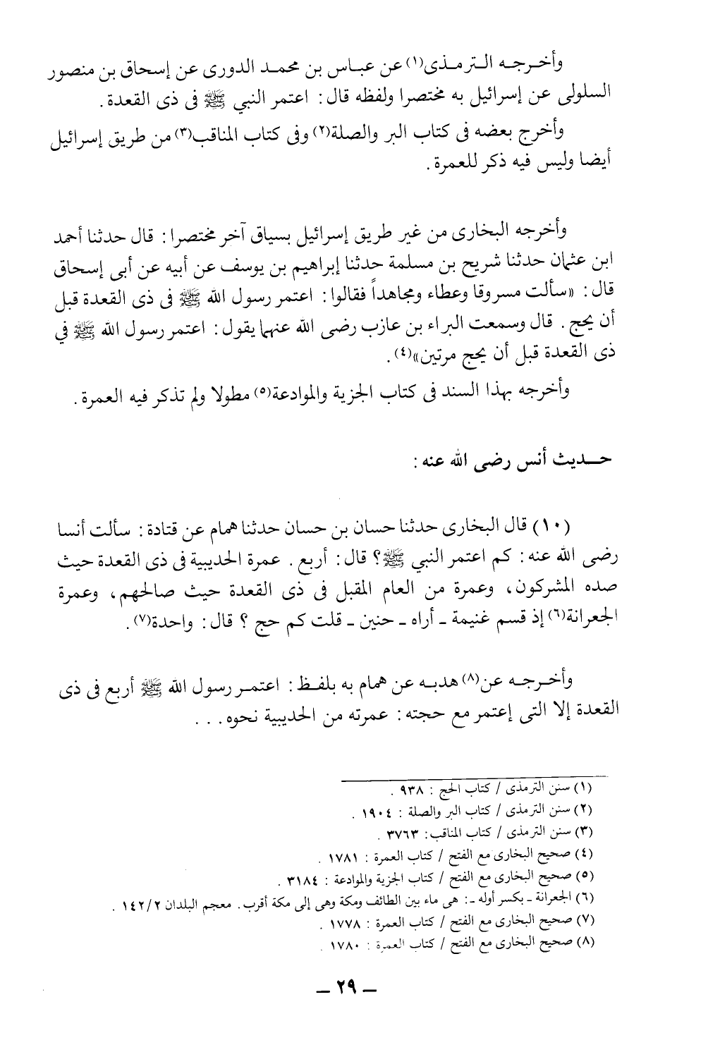 (10) قال البخاري حدثنا حسان بن حسان حدثنا همام عن قتادة: سألت أنساً رضي الله عنه: كم اعتمر النبي صلى الله عليه وسلم. قال: "أربع عمرة الحديبية في ذي القعدة حيث صده المشركون، وعمرة من العام المقبل في ذي القعدة حيث صالحهم، وعمرة الجعرانة6 إذ قسم غنيمة - أراه حنين - قلت كم حج؟ قال: واحدة"7.