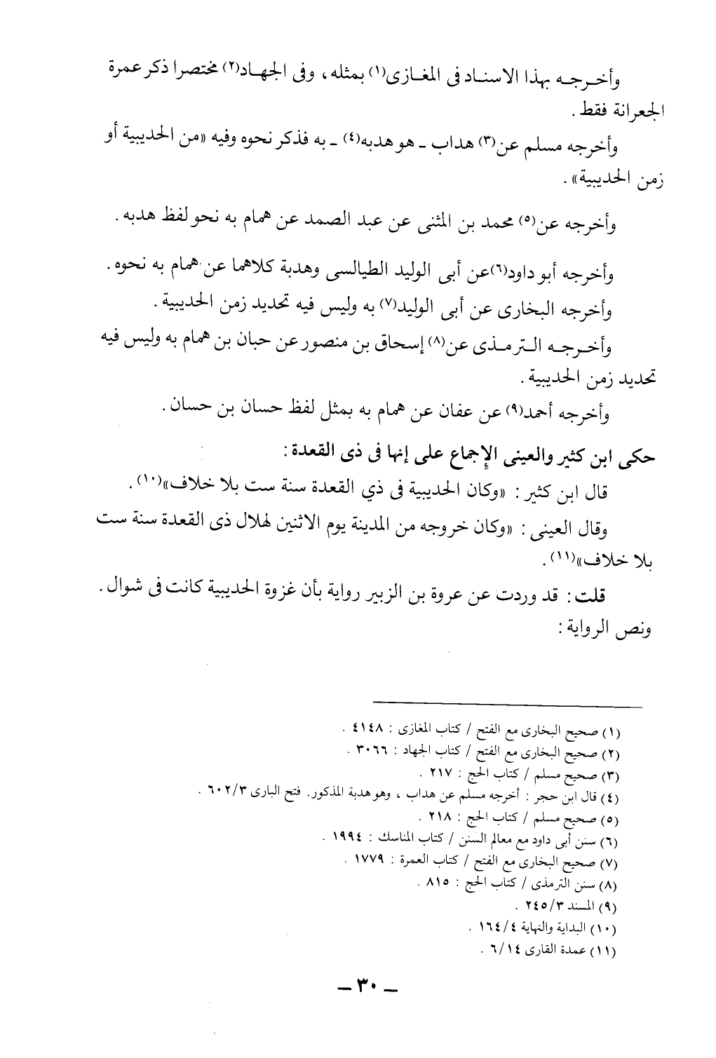 وقال العيني: "وكان خروجه من المدينة يوم الاثنين لهلال ذي القعدة سنة ست بلا خلاف" 11.