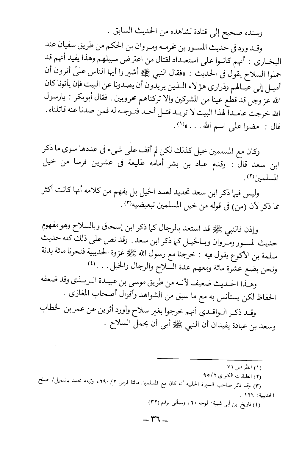 وإذن فالنبي صلى الله عليه وسلم قد استعد بالرجال كما ذكر ابن إسحاق وبالسلاح، وهو مفهوم حديث المسور ومروان وبالخيل كما ذكر ابن سعد، وقد نص على ذلك كله حديث سلمة بن الأكوع يقول فيه: خرجنا مع رسول الله صلى الله عليه وسلم غزوة الحديبية فنحرنا مائة بدنة ونحن بضع عشرة مائة ومعهم عدة السلاح والرجال والخيل ... 4